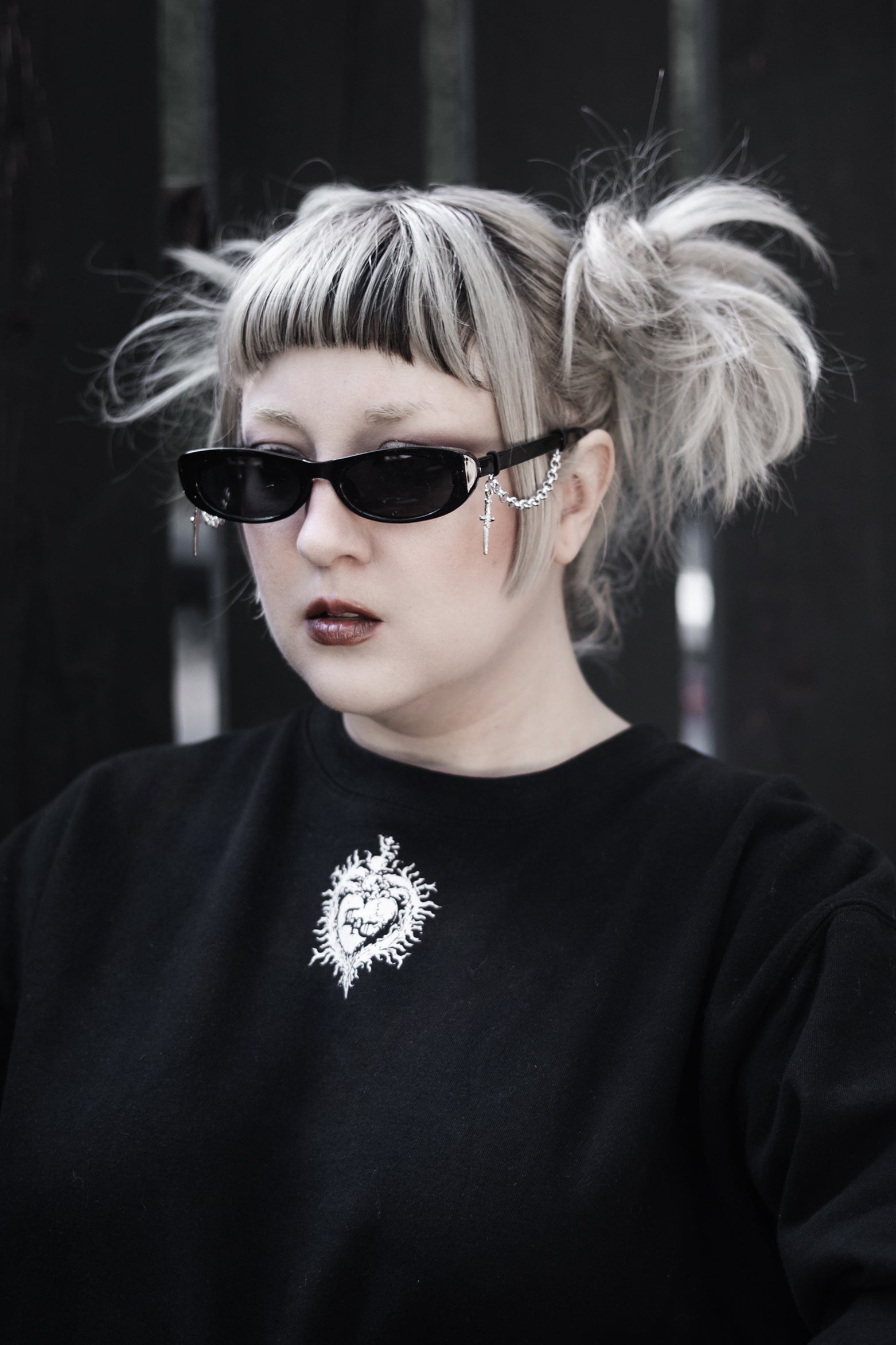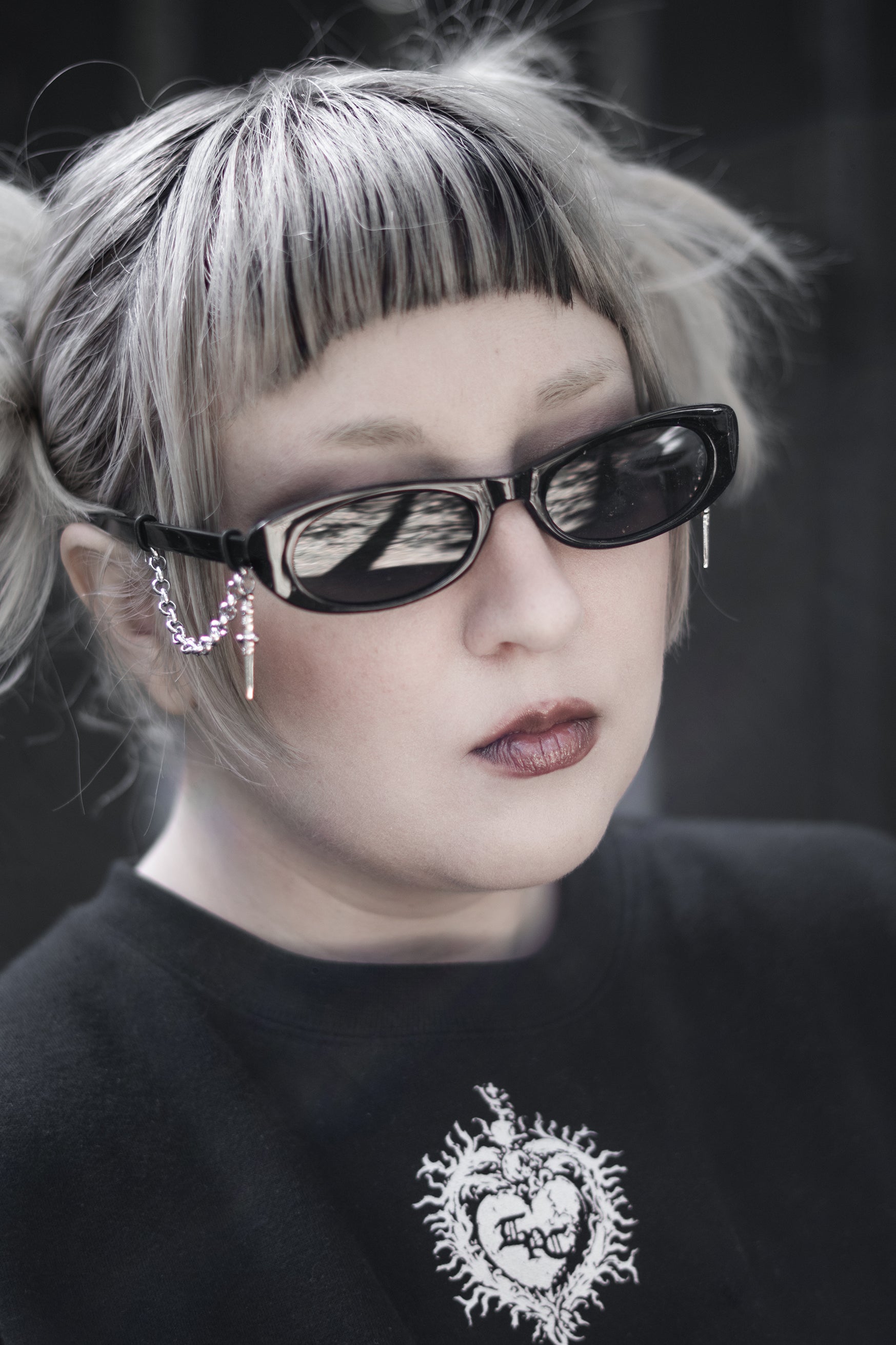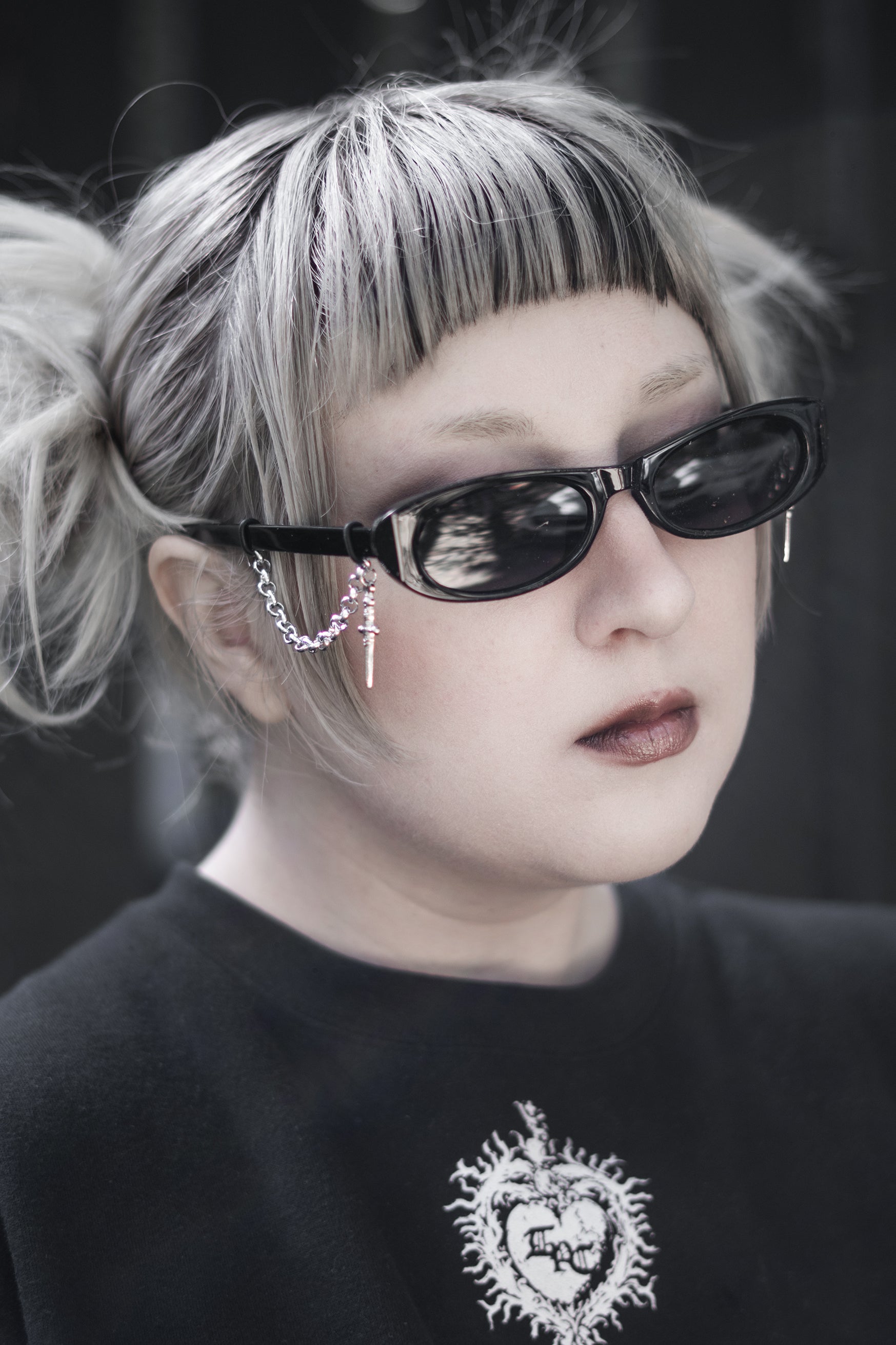 Silver chain detailing hangs from each arm, finished with dagger charms that move quietly when you do. The contrast is deliberate: clean lines against violent hardware. Nothing extra. Nothing soft.