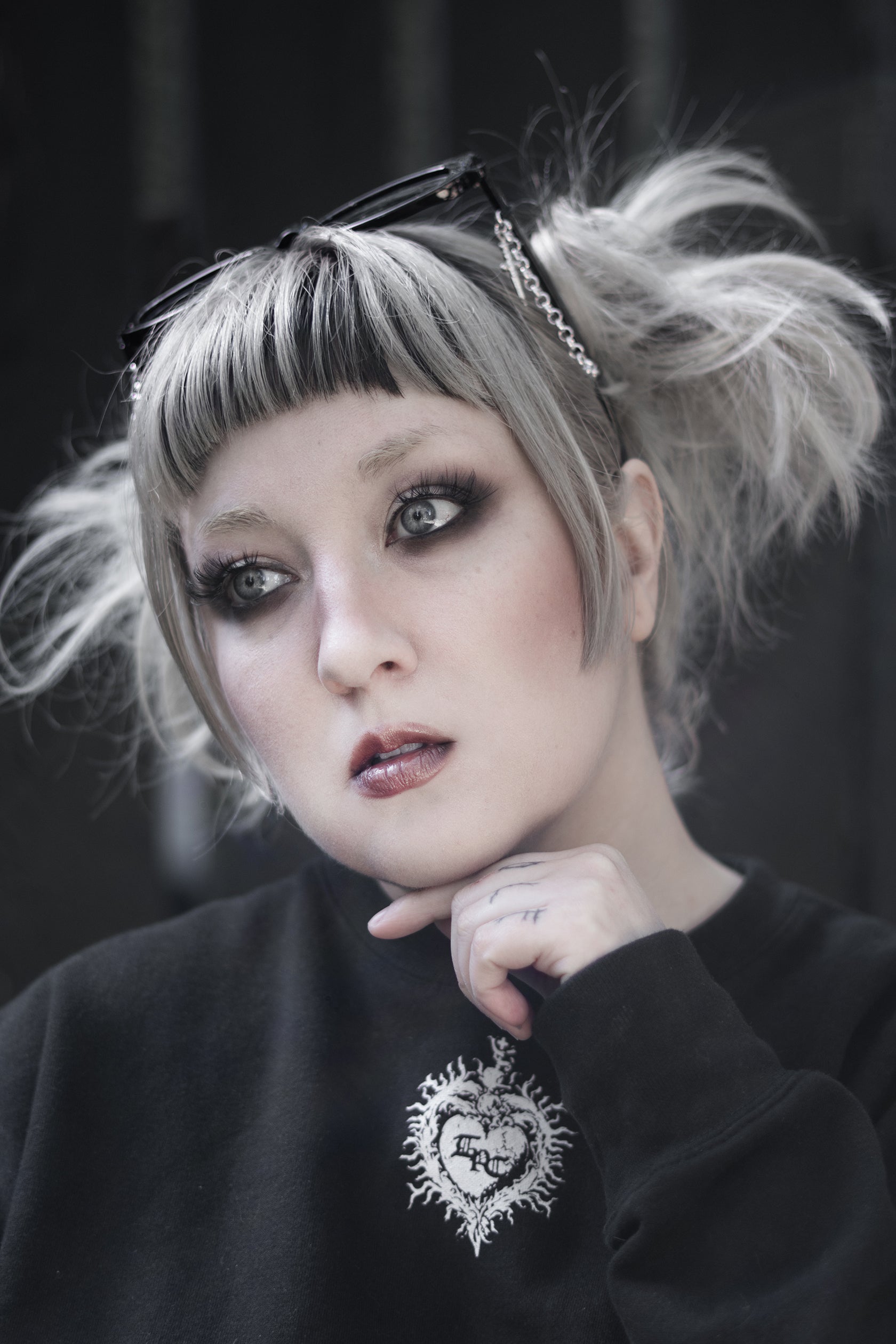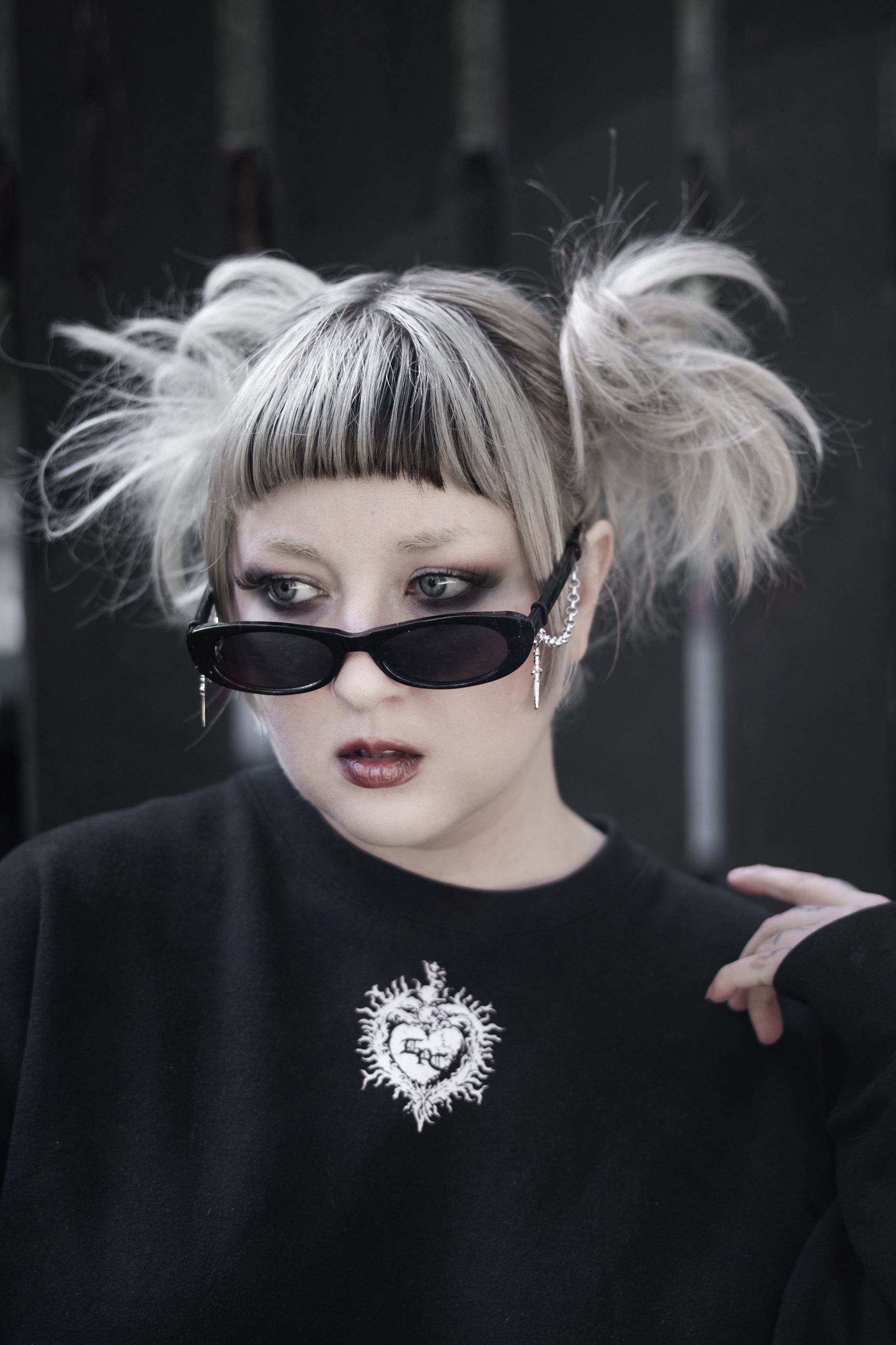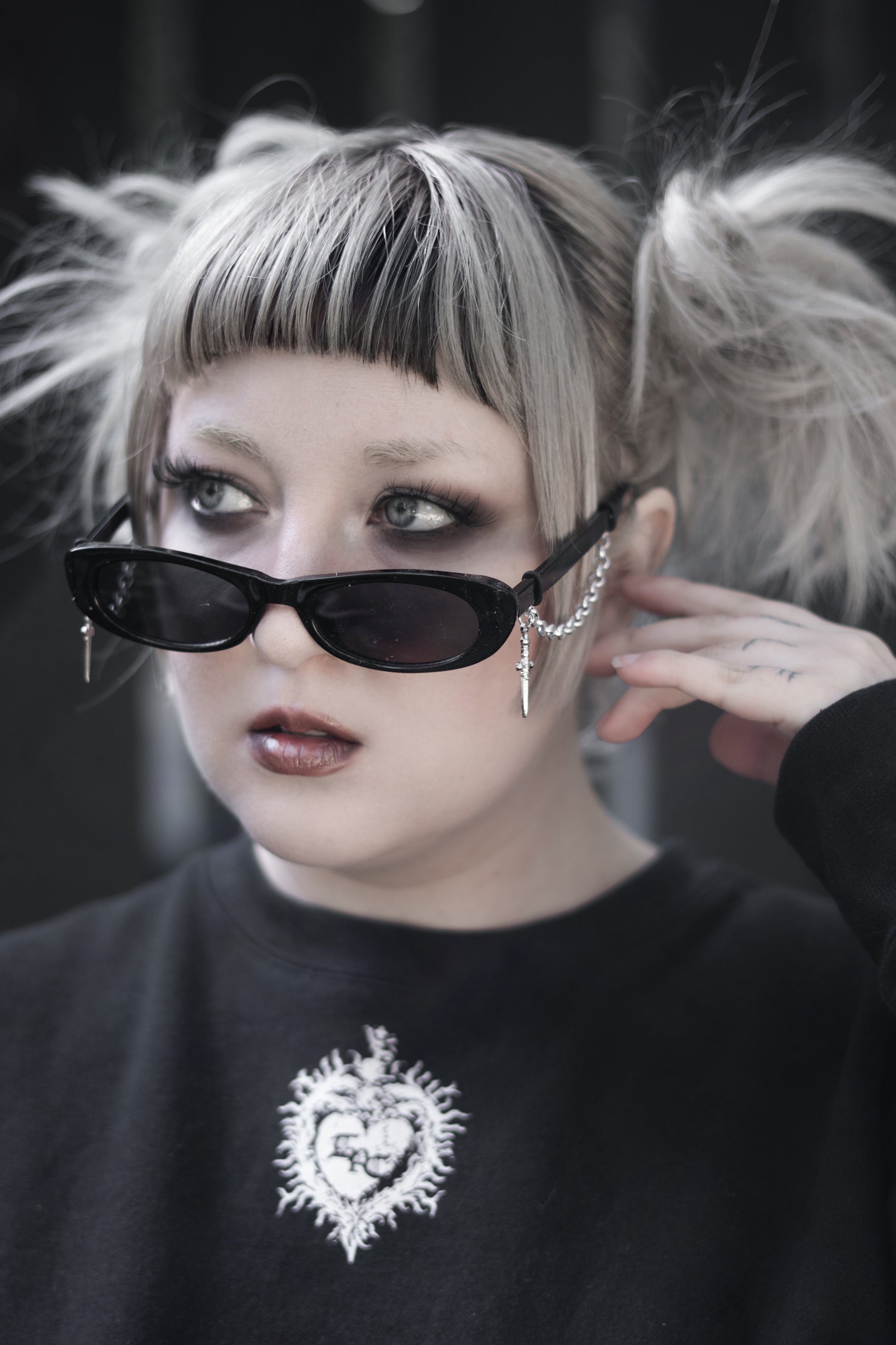 Silver chain detailing hangs from each arm, finished with dagger charms that move quietly when you do. The contrast is deliberate: clean lines against violent hardware. Nothing extra. Nothing soft.