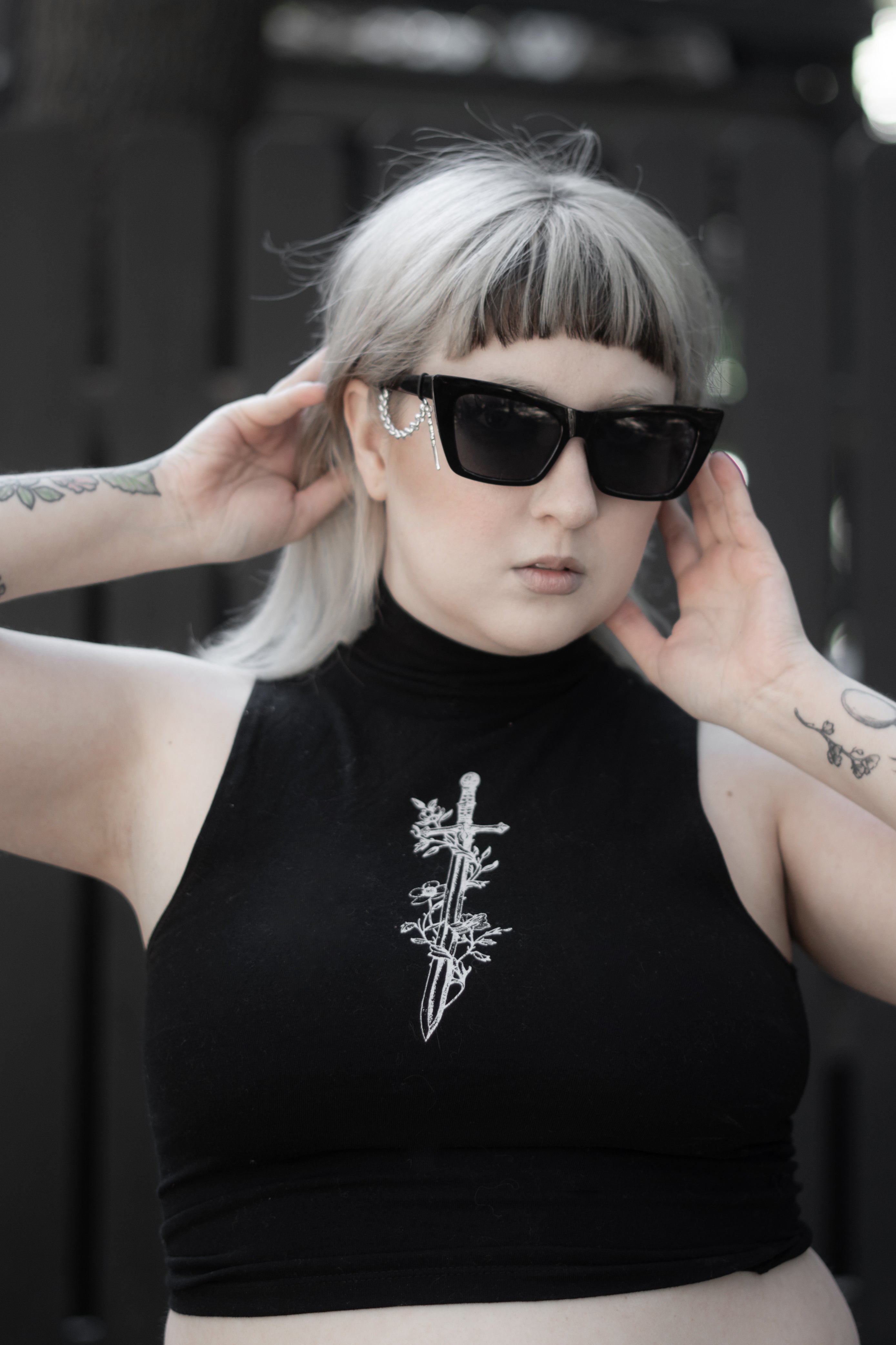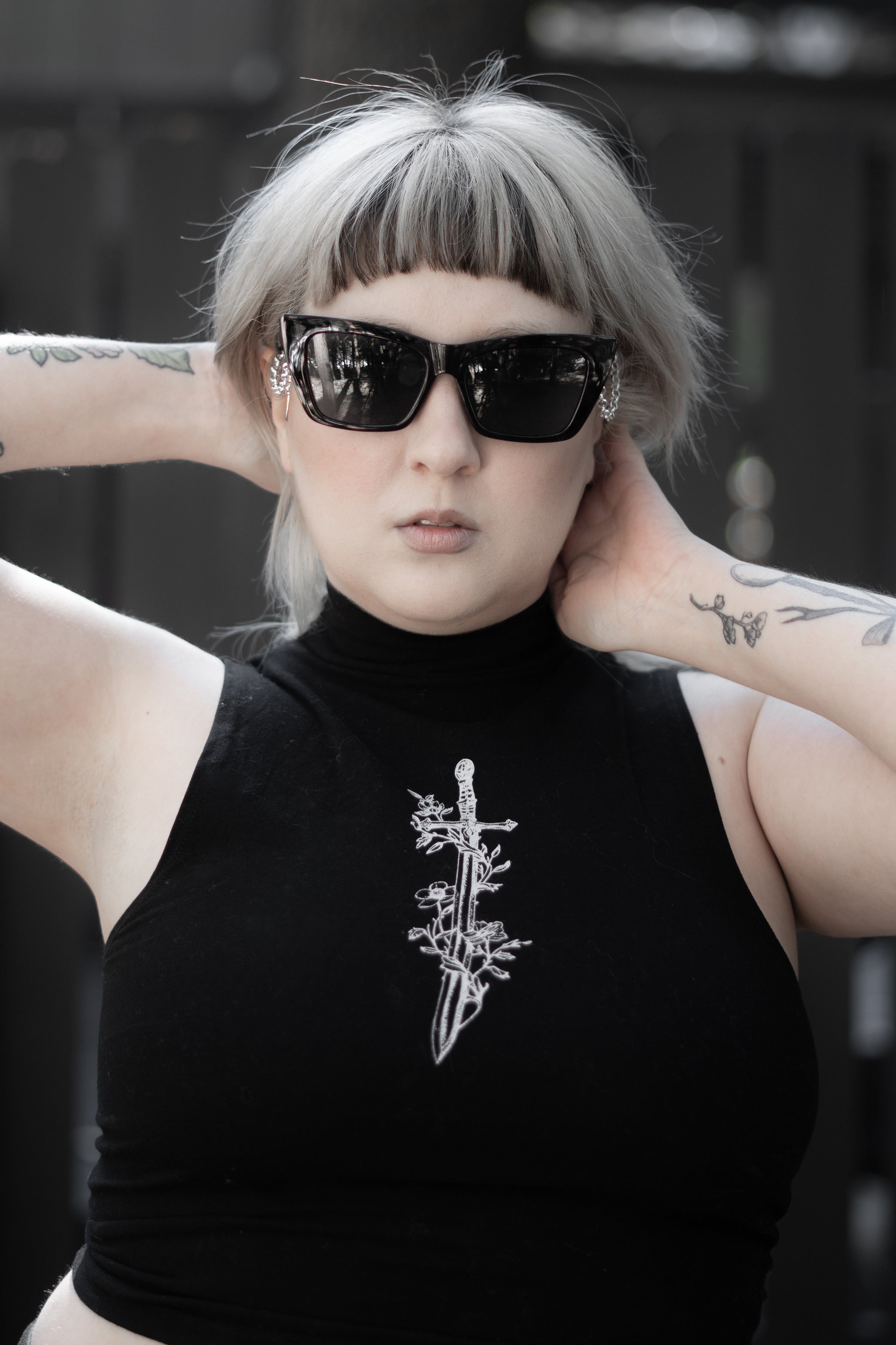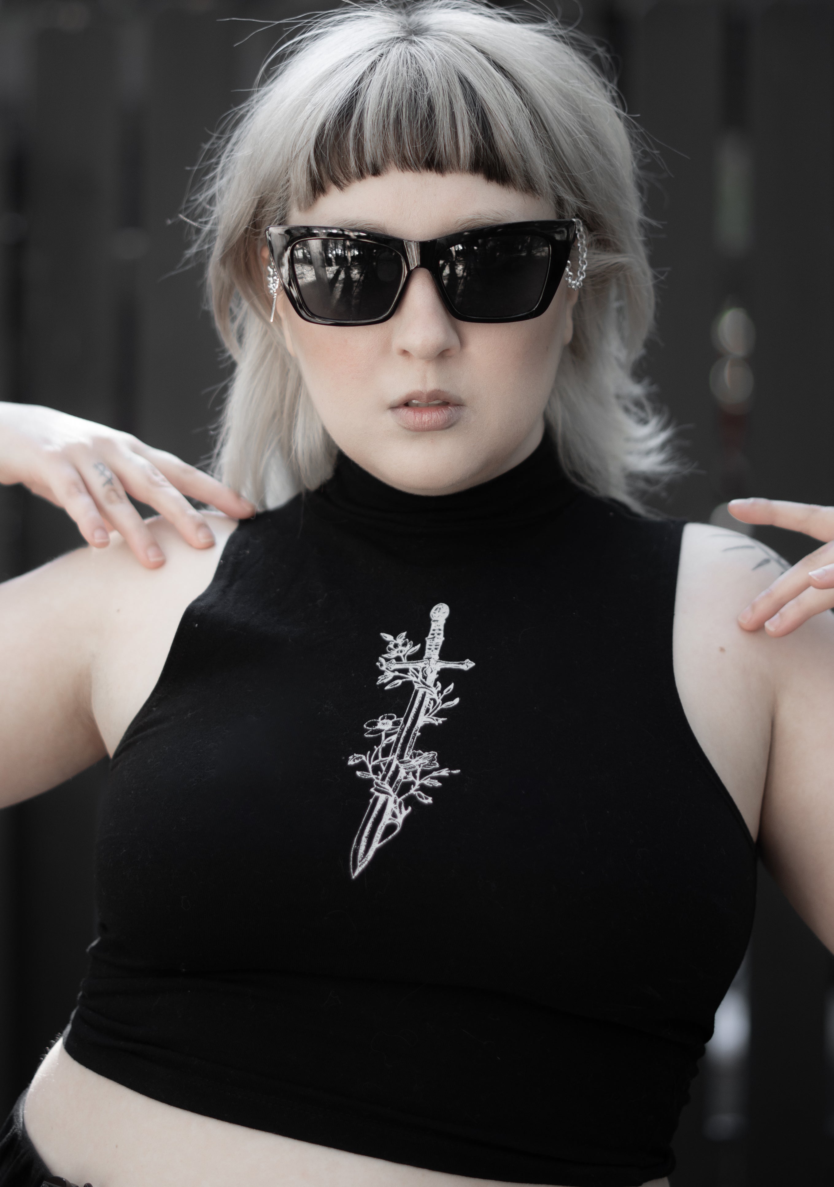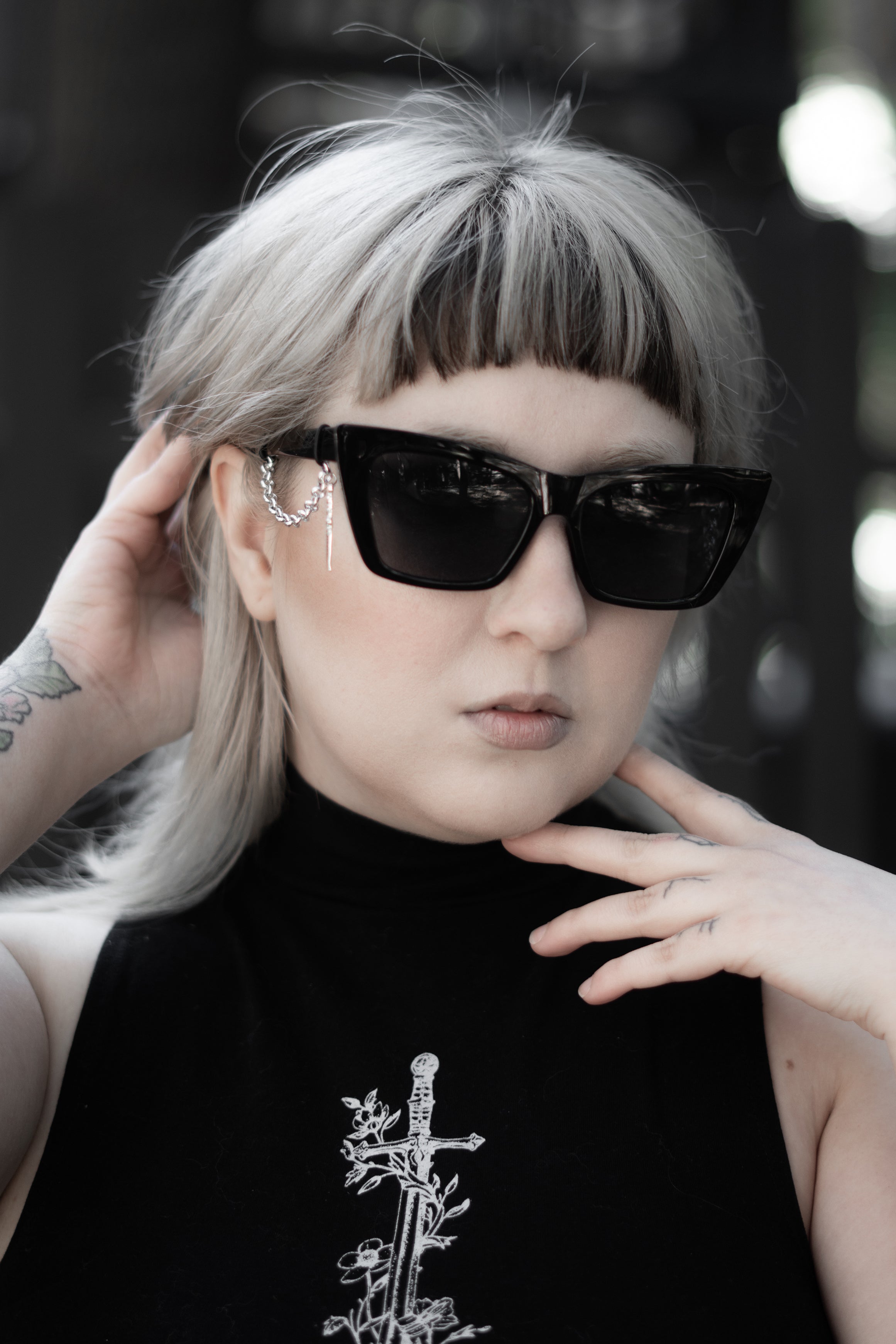 Silver chain detailing hangs from each arm, finished with dagger charms that move with quiet authority. The hardware is deliberate ornament turned weapon, beauty edged with threat.