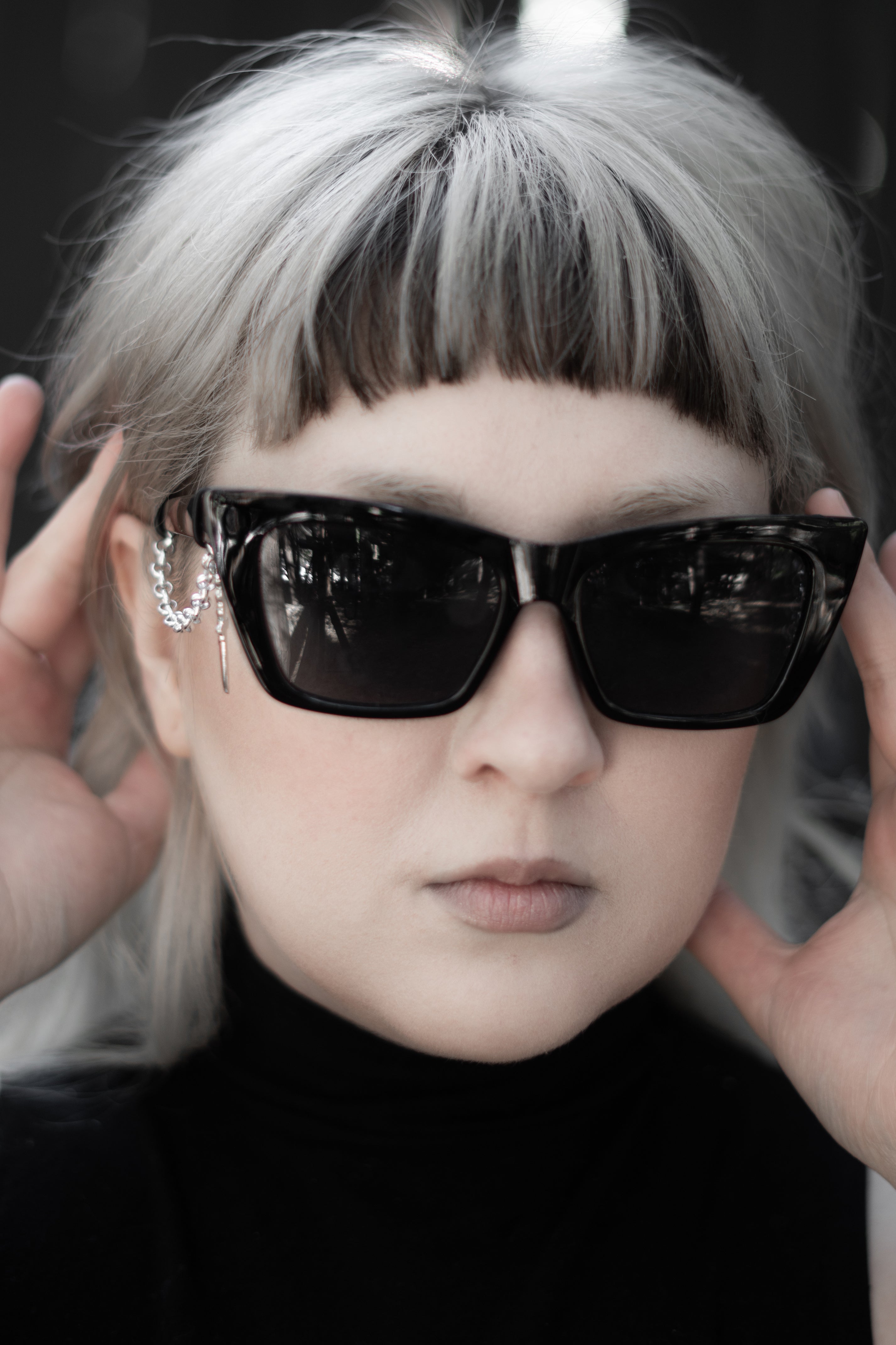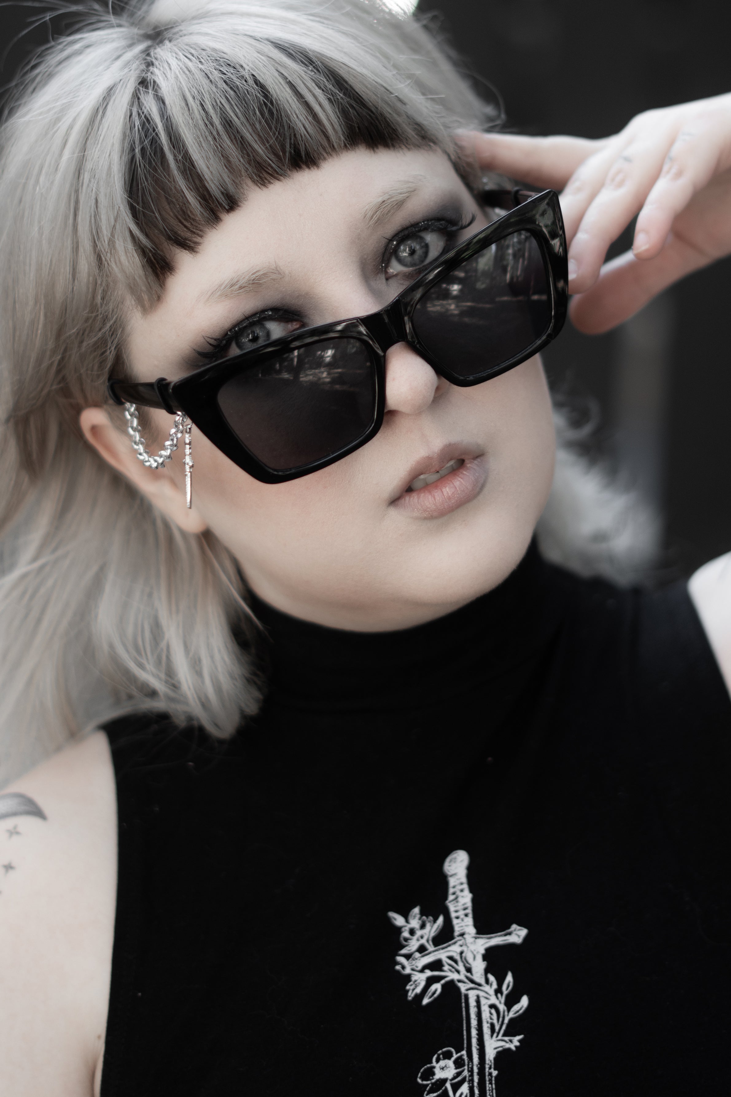 Last Rites is sharp and uncompromising. A structured black cat-eye frame with dark lenses, cut clean and worn with intention.