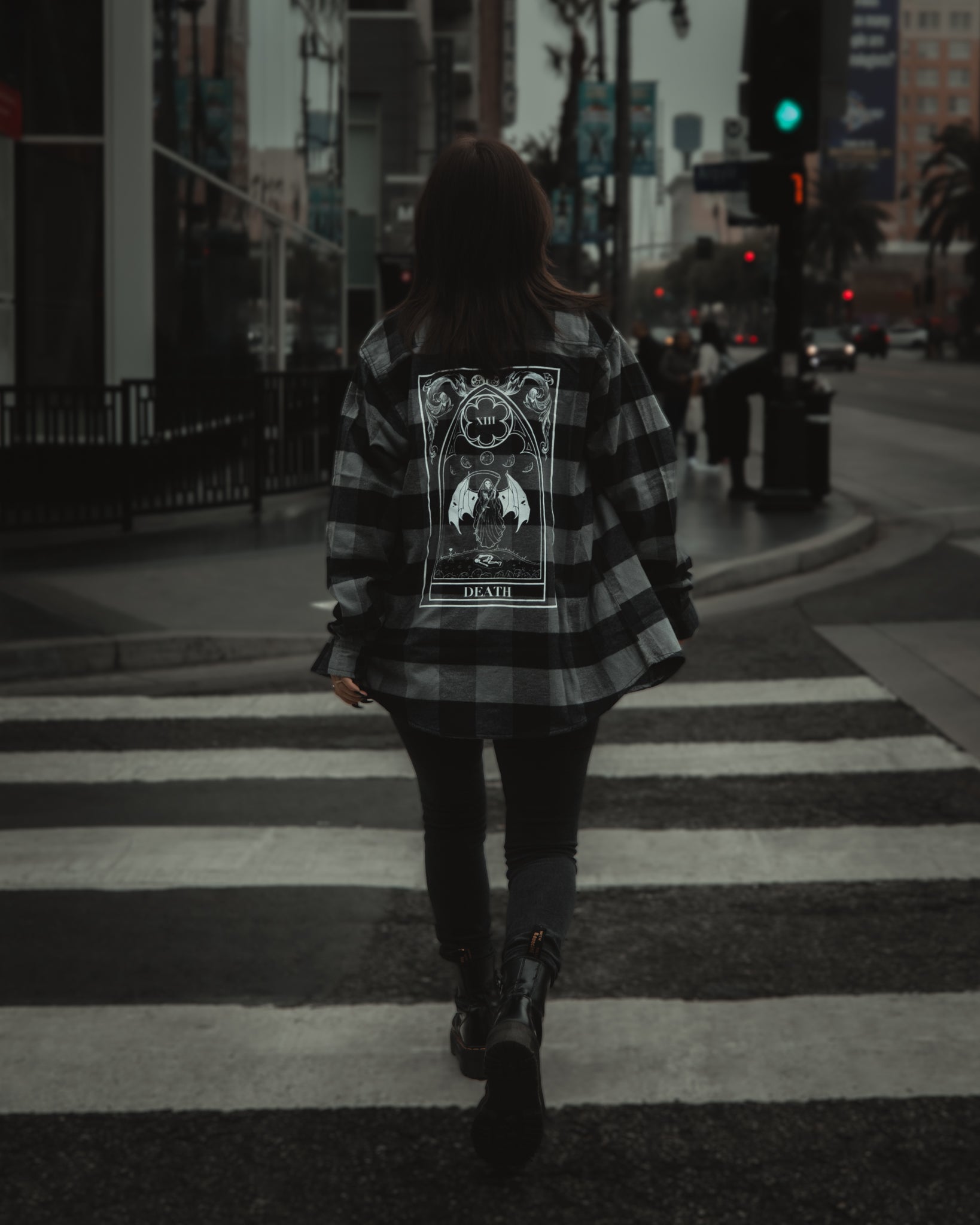Our signature super soft relaxed fit flannel with our Death tarot card on back