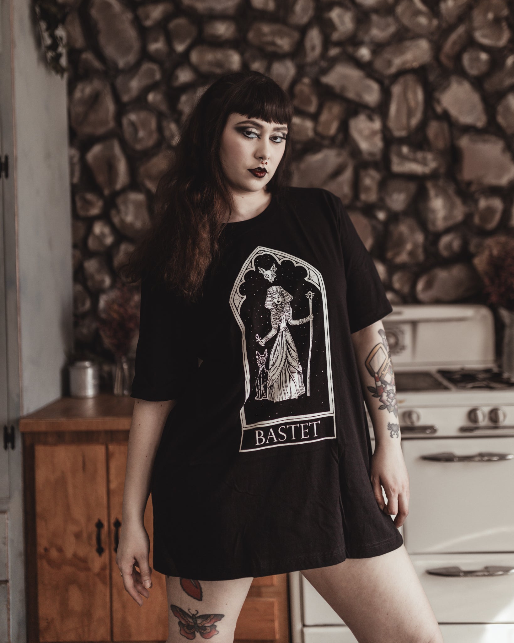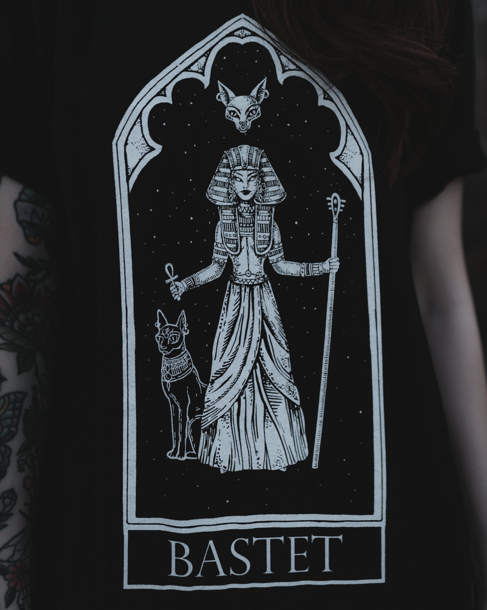 Invoke the power of the goddess with the Bastet Oracle T-Shirt. Featuring an exclusive occult-inspired graphic of the Egyptian cat deity, this black unisex tee channels dark mysticism, tarot energy, and rock-n-roll edge.