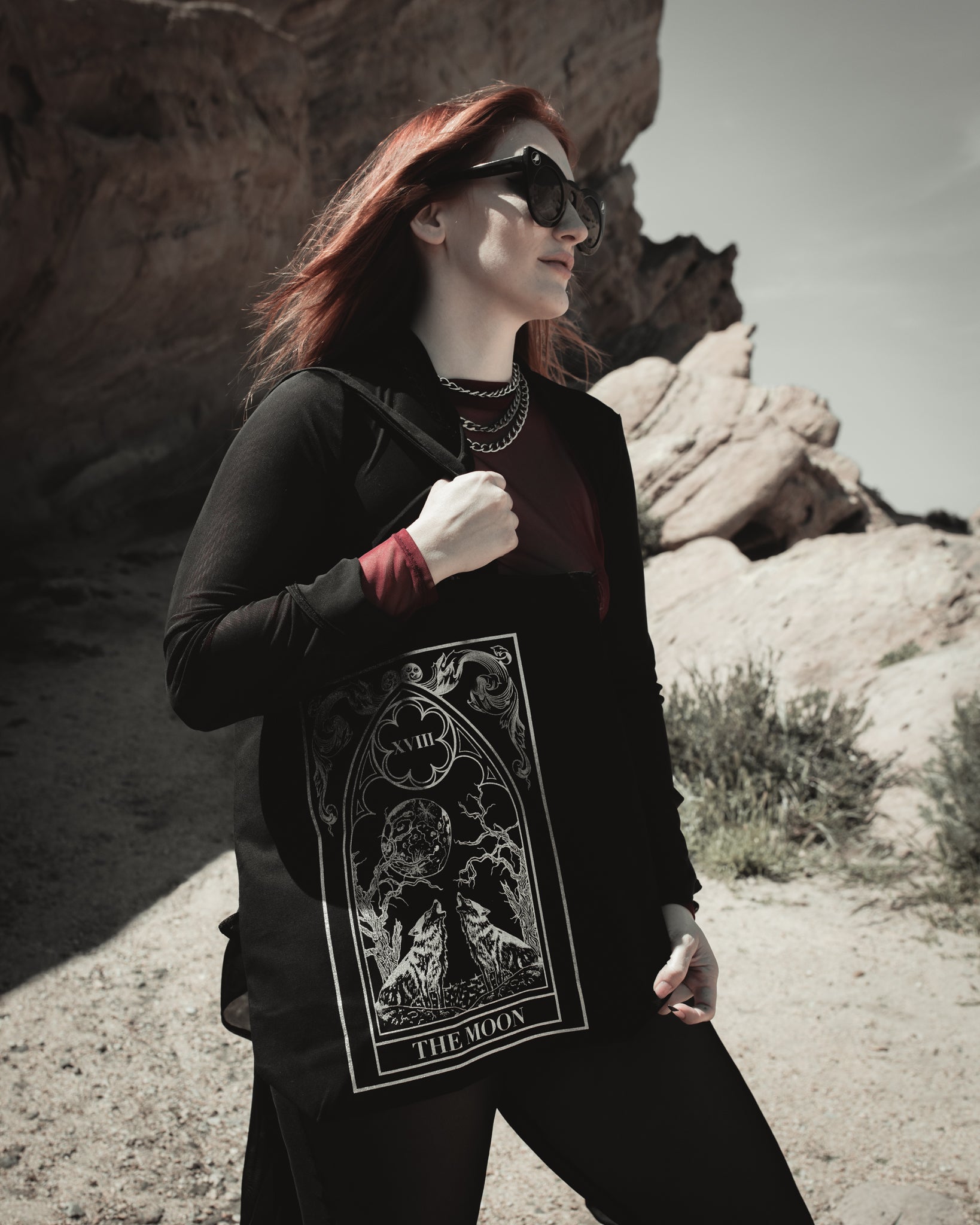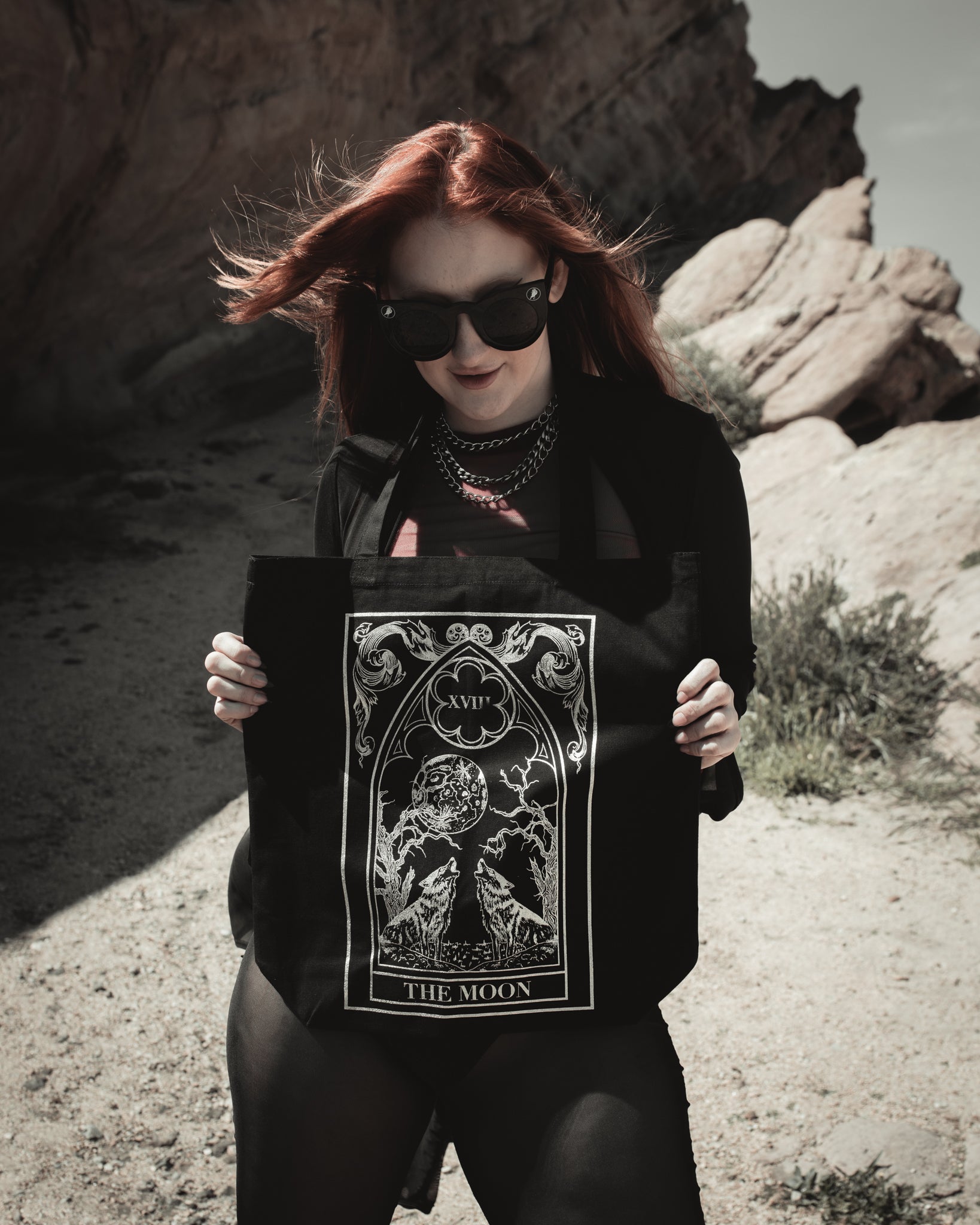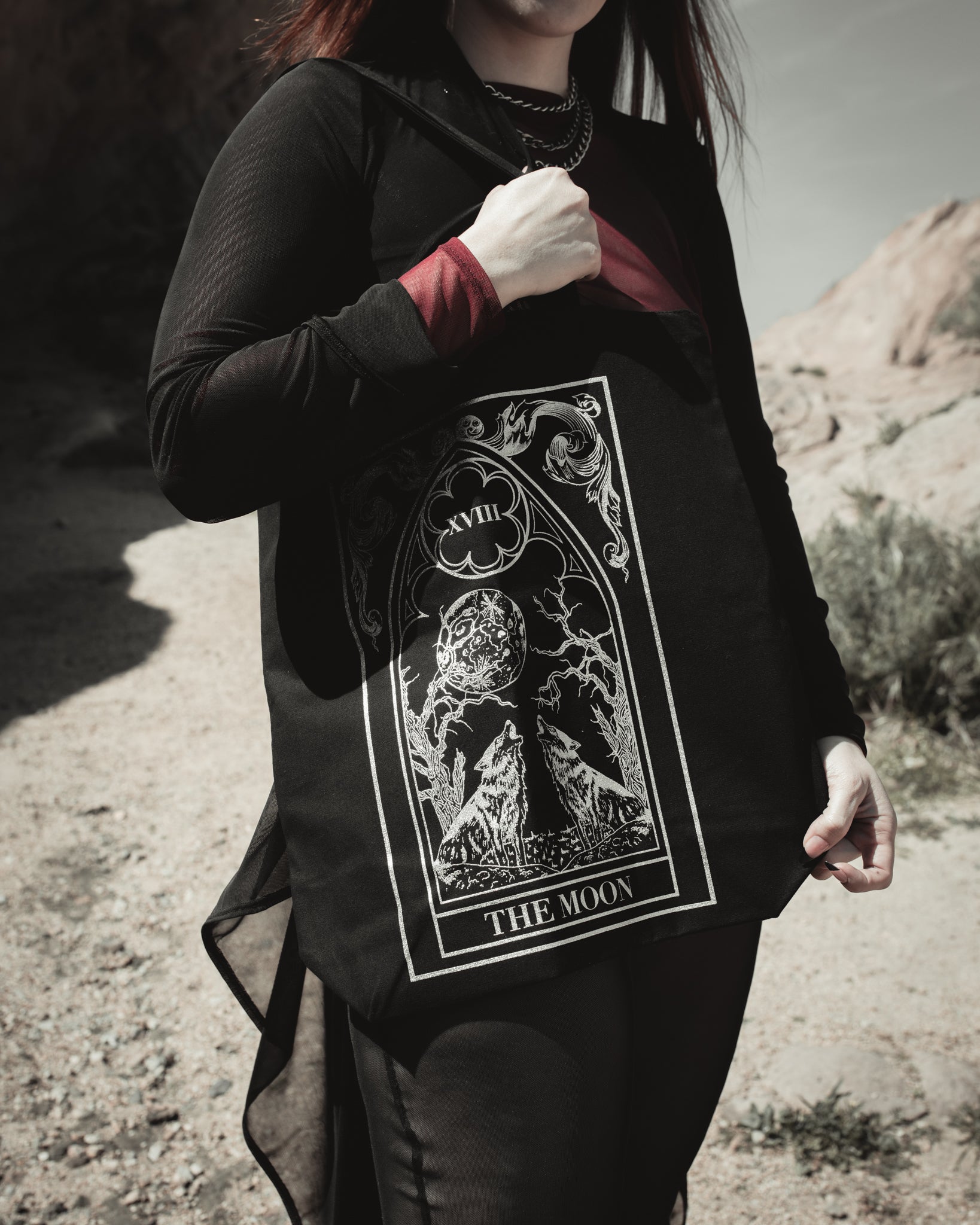Carry a piece of the night with you... Featuring the enchanting Moon tarot card design, this 100% organic cotton tote is perfect for witches, tarot readers, and lunar dreamers alike. Crafted from durable 8 oz twill with a roomy 16″ × 14½″ × 5″ shape, it’s ideal for carrying spellbooks, crystals, market finds, or everyday essentials. With eco-friendly materials and a mystical gothic aesthetic, this tote is your perfect companion for rituals, readings, and moonlit adventures.