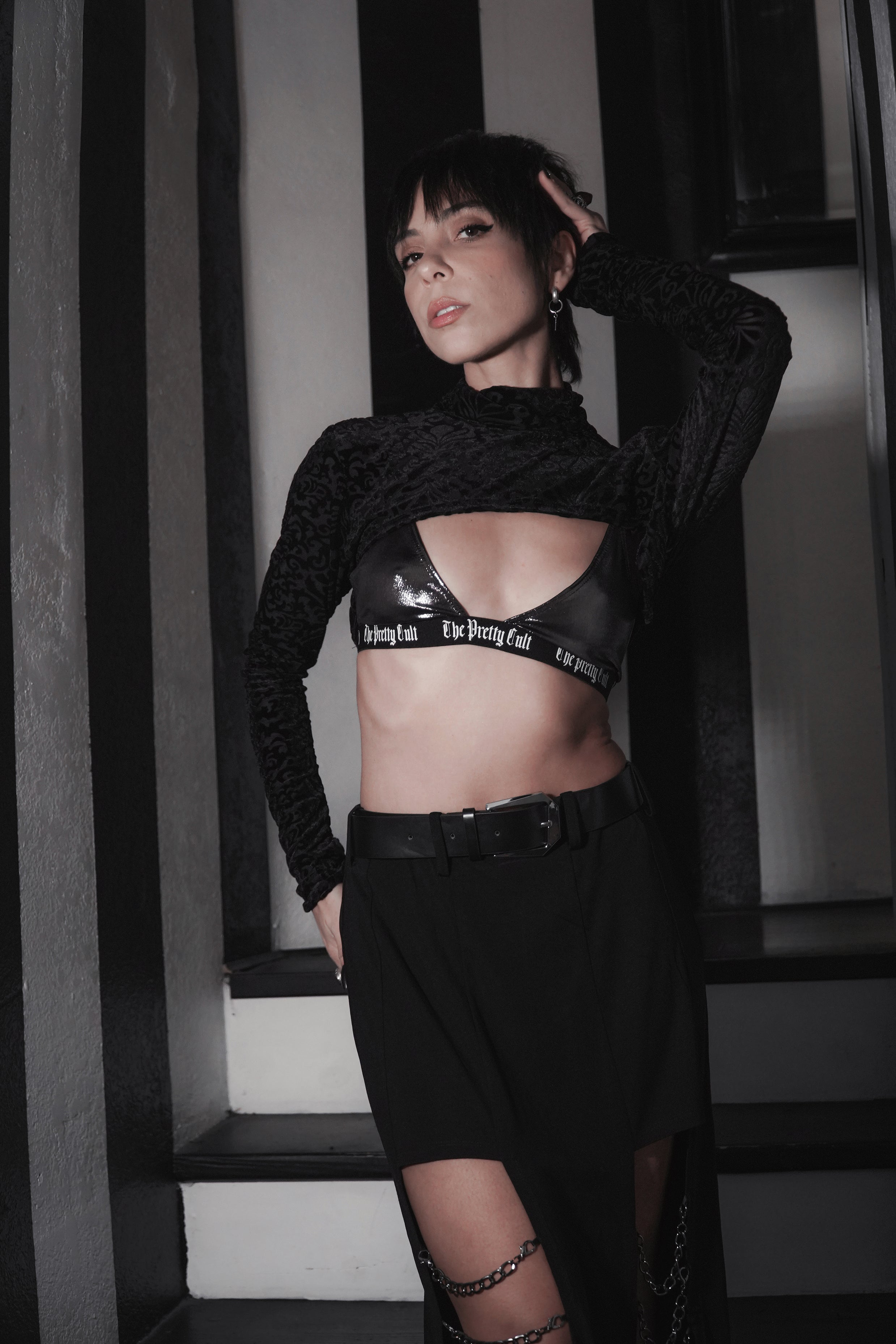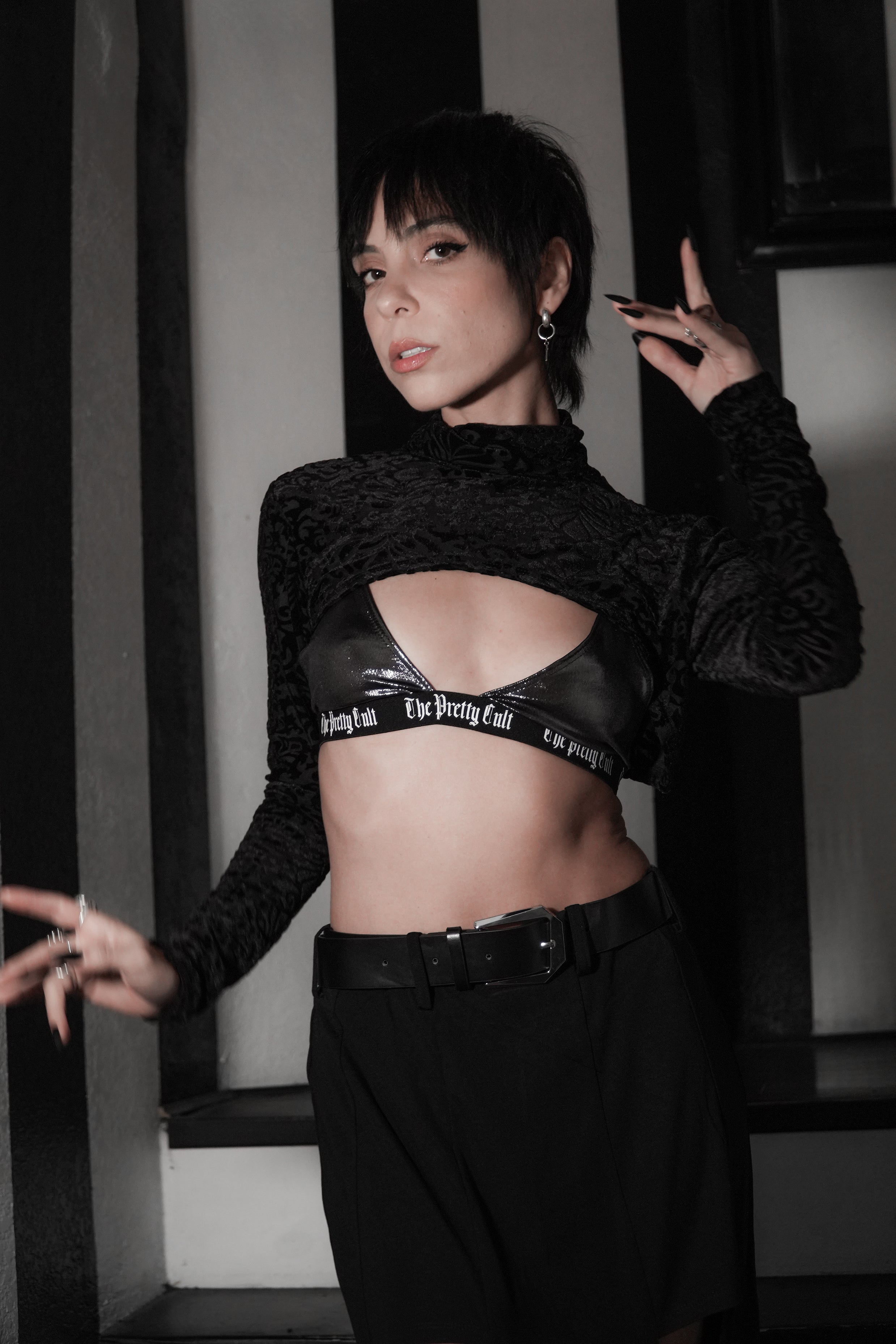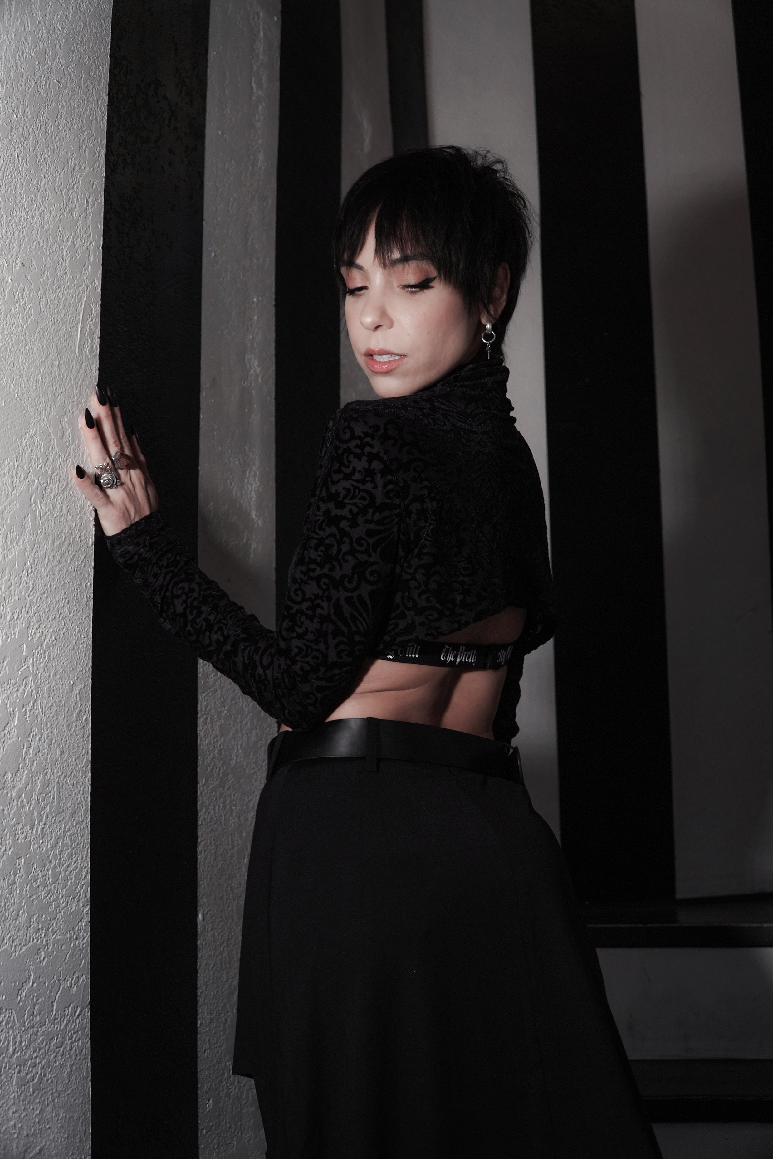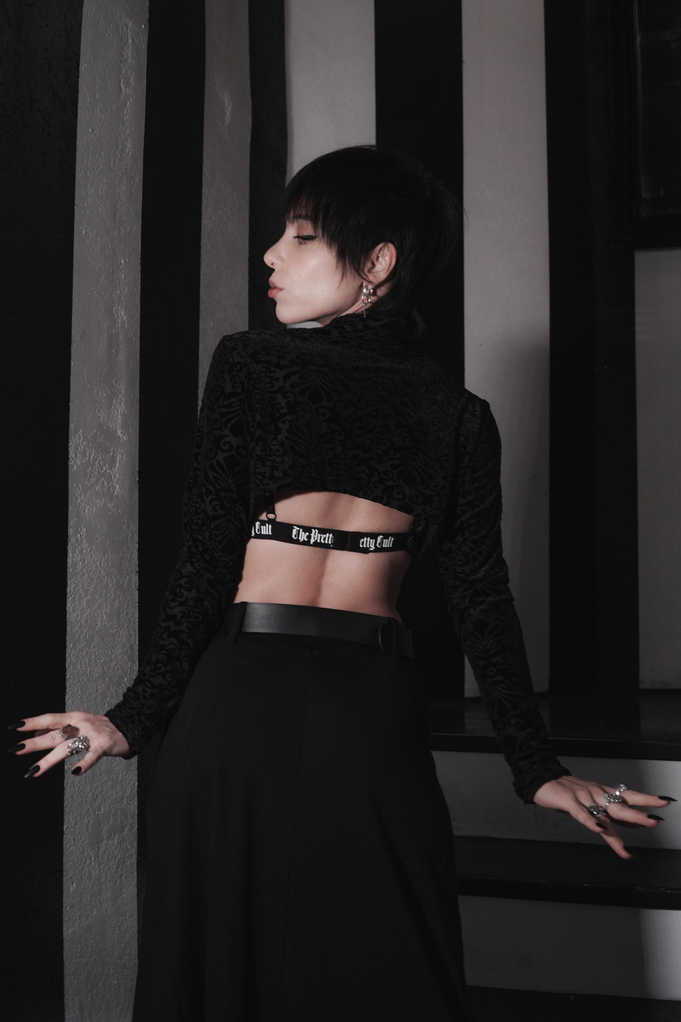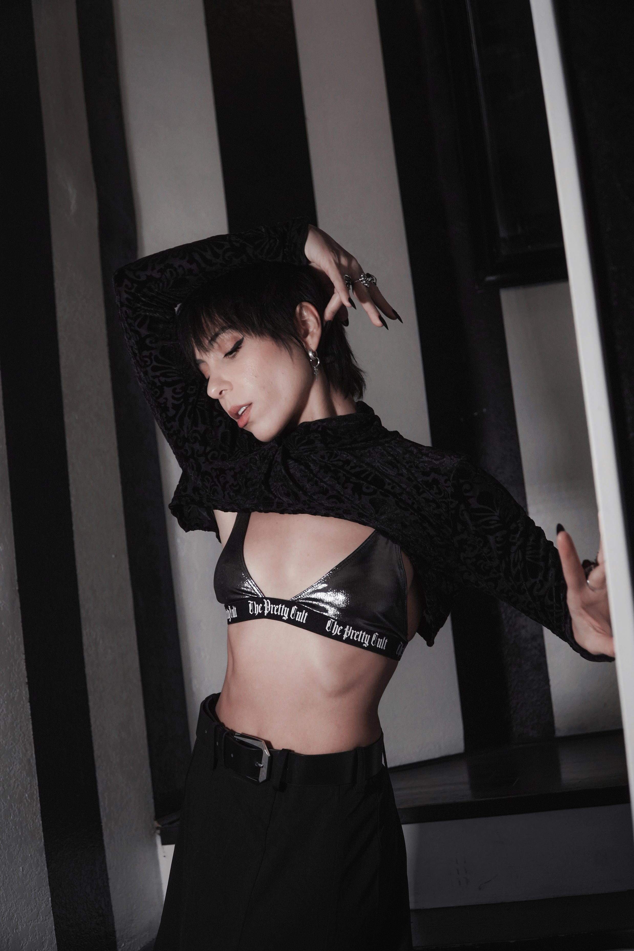 The Dark Solstice Shrug brings a touch of midnight luxury to your layers. Made from soft burnout velvet, it creates a shadowy, textured pattern that shifts with the light subtle, witchy, and unmistakably dramatic. The cropped silhouette and long sleeves make it perfect for throwing over slip dresses, tanks, or statement tops, adding instant depth and mood to any look. Lightweight with a gentle stretch, it’s an effortless piece for colder nights, rituals, and anything that calls for a little dark elegance.