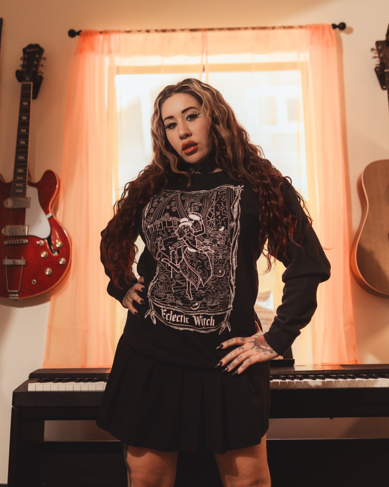 For the dreamers who dance between chords and constellations the Eclectic Witch Sweatshirt is an ode to rhythm, rebellion, and moonlit melodies. Inspired by the spirit of Stevie Nicks and the poetry of rock ’n’ roll mysticism, this piece captures the essence of free-spirited magick a harmony of lace, leather, and lunar light.