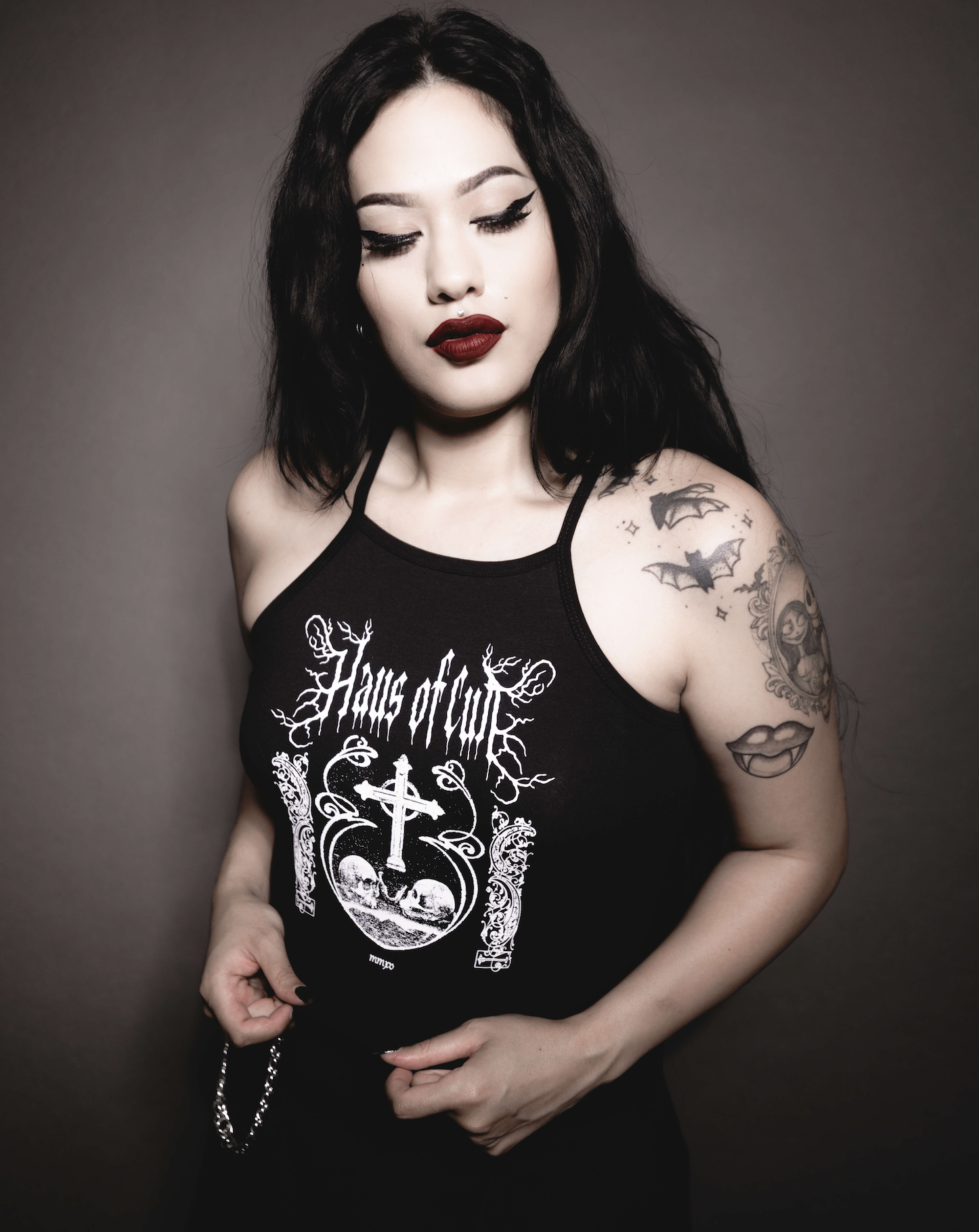 The Haus Of Cult Halter Crop is your new go-to for witchy nights and dark days. Made from soft, stretchy cotton-spandex for a comfortable, form-fitting feel, this halter crop brings bold energy to every outfit. Pair it with leather, mesh, or high-waisted skirts for that signature Pretty Cult look — made for those who worship at the altar of rock ’n’ roll, magic, and self-expression.