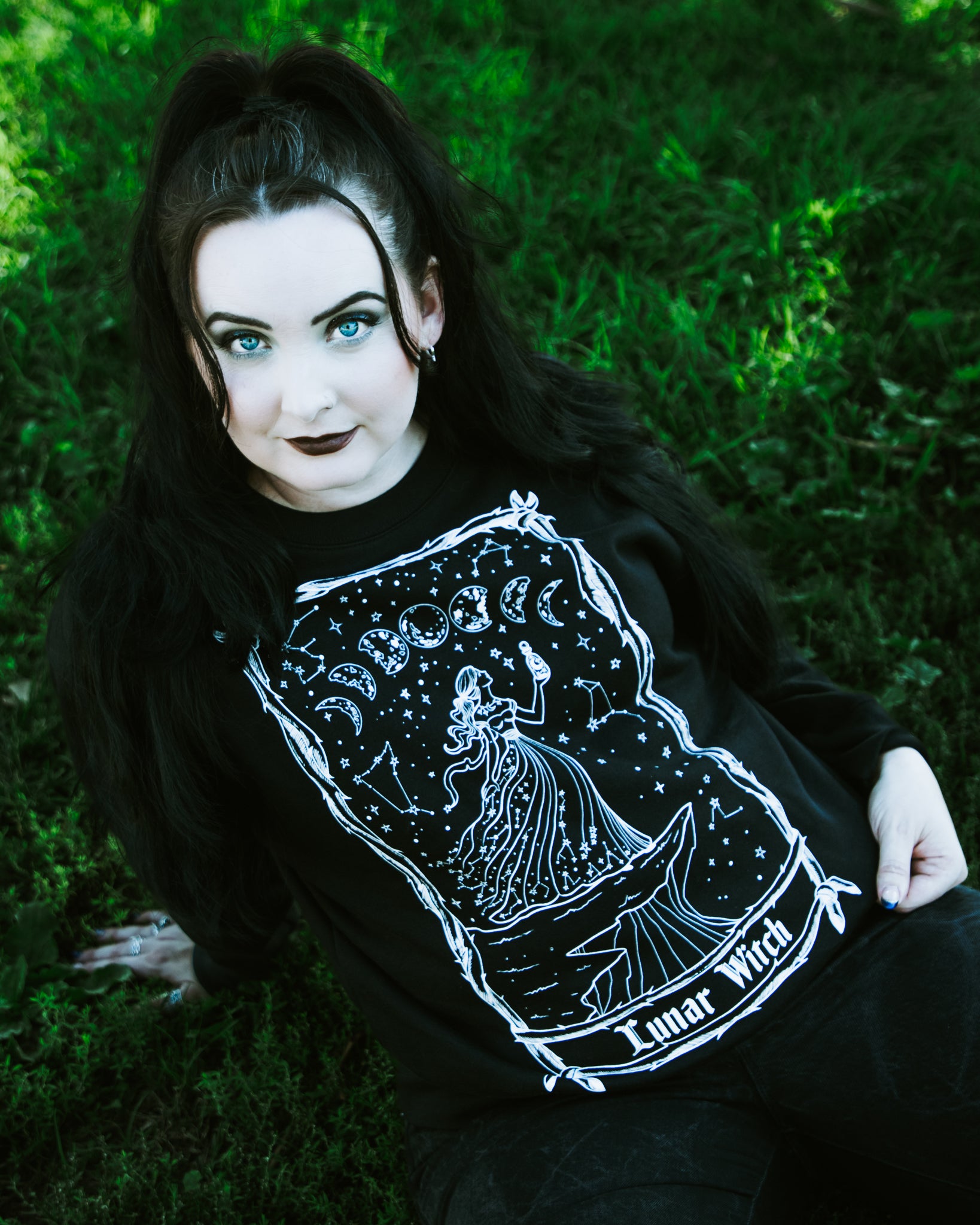 Under the glow of moonlight lies quiet power. The Lunar Witch Sweatshirt is crafted for those who read the phases of their own spirit, seeking solace in the night and strength in stillness. Made from a heavy-weight cotton face and a soft fleece interior, it envelops you like the hush of midnight pages and the hum of silver tides.
