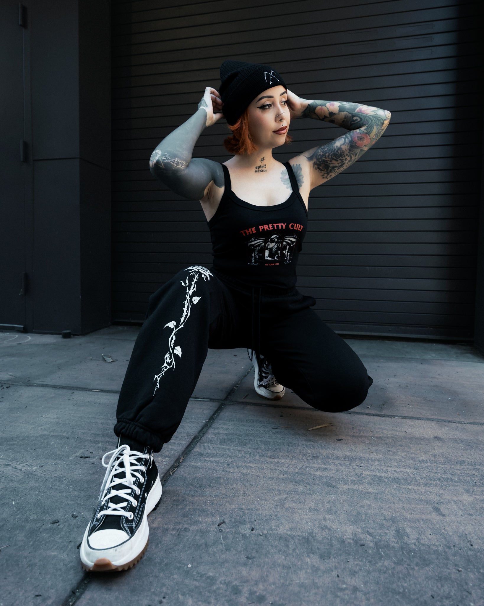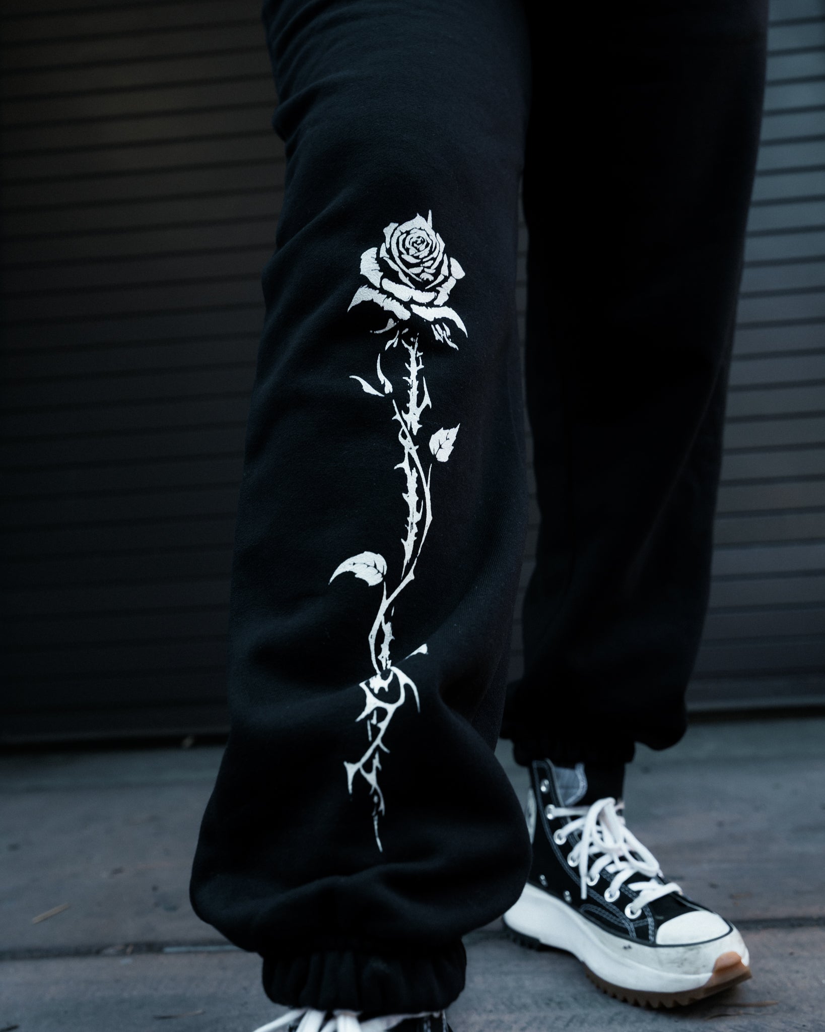Summon your dark side with the Thorn Joggers. Soft black fleece sweatpants featuring a bold white screen printed thorn design climbing up the leg. Merging comfort and chaos, these joggers channel that signature Pretty Cult energy effortlessly witchy, a little dangerous, and ready for anything.