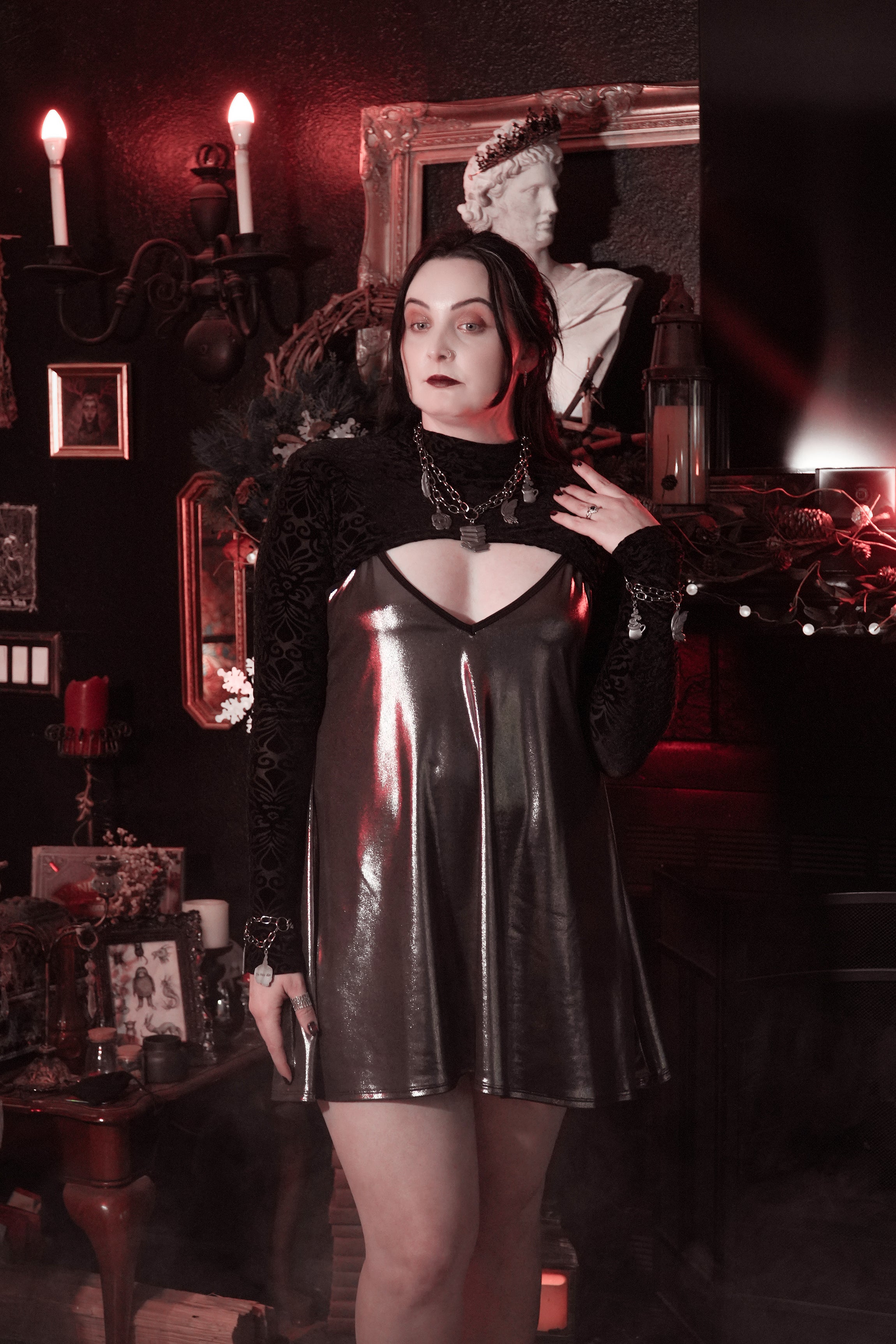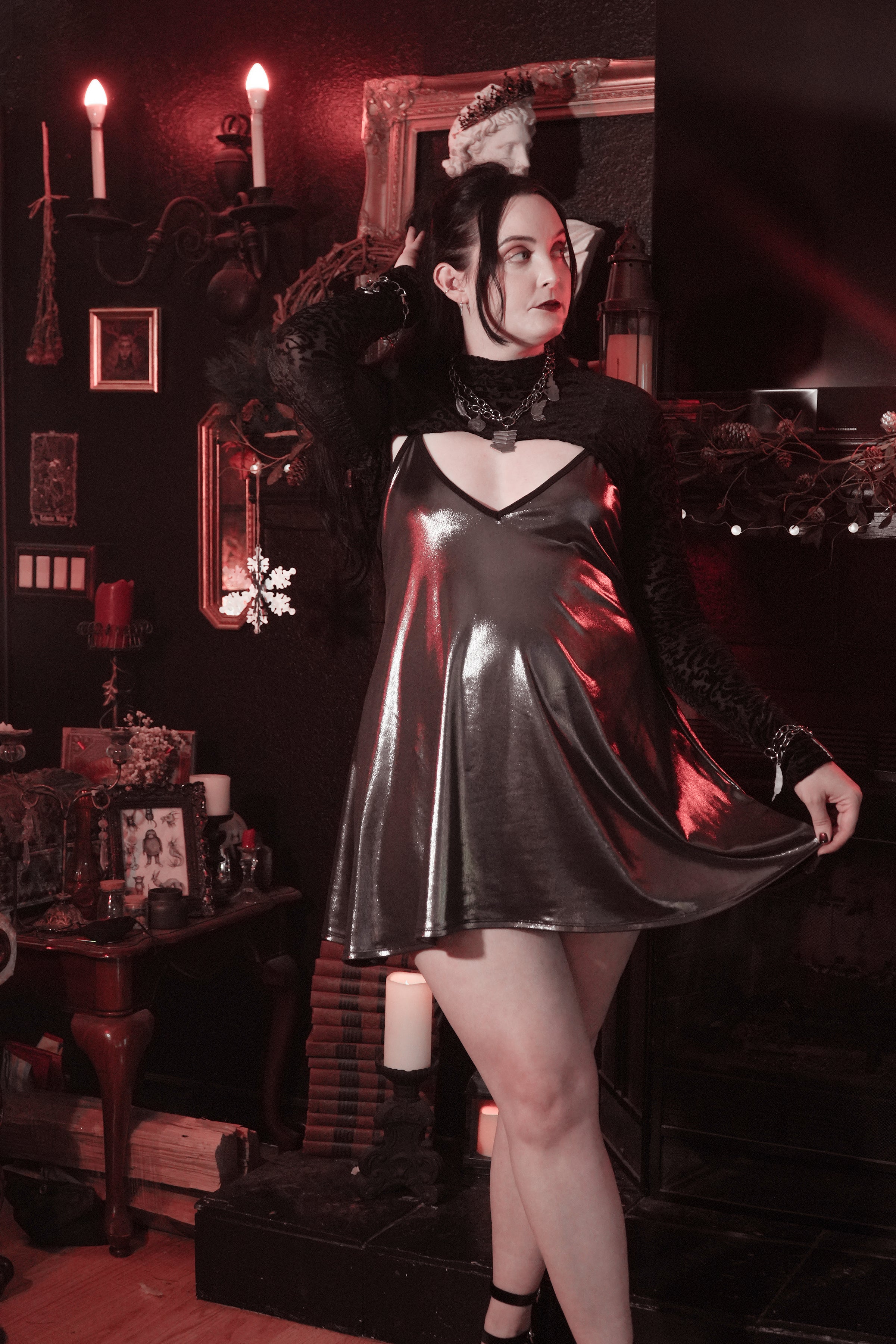 Made of liquid gun metal silver fabric that is super stretchy fabric that is a loose fitting style but still hugs in all the right places.