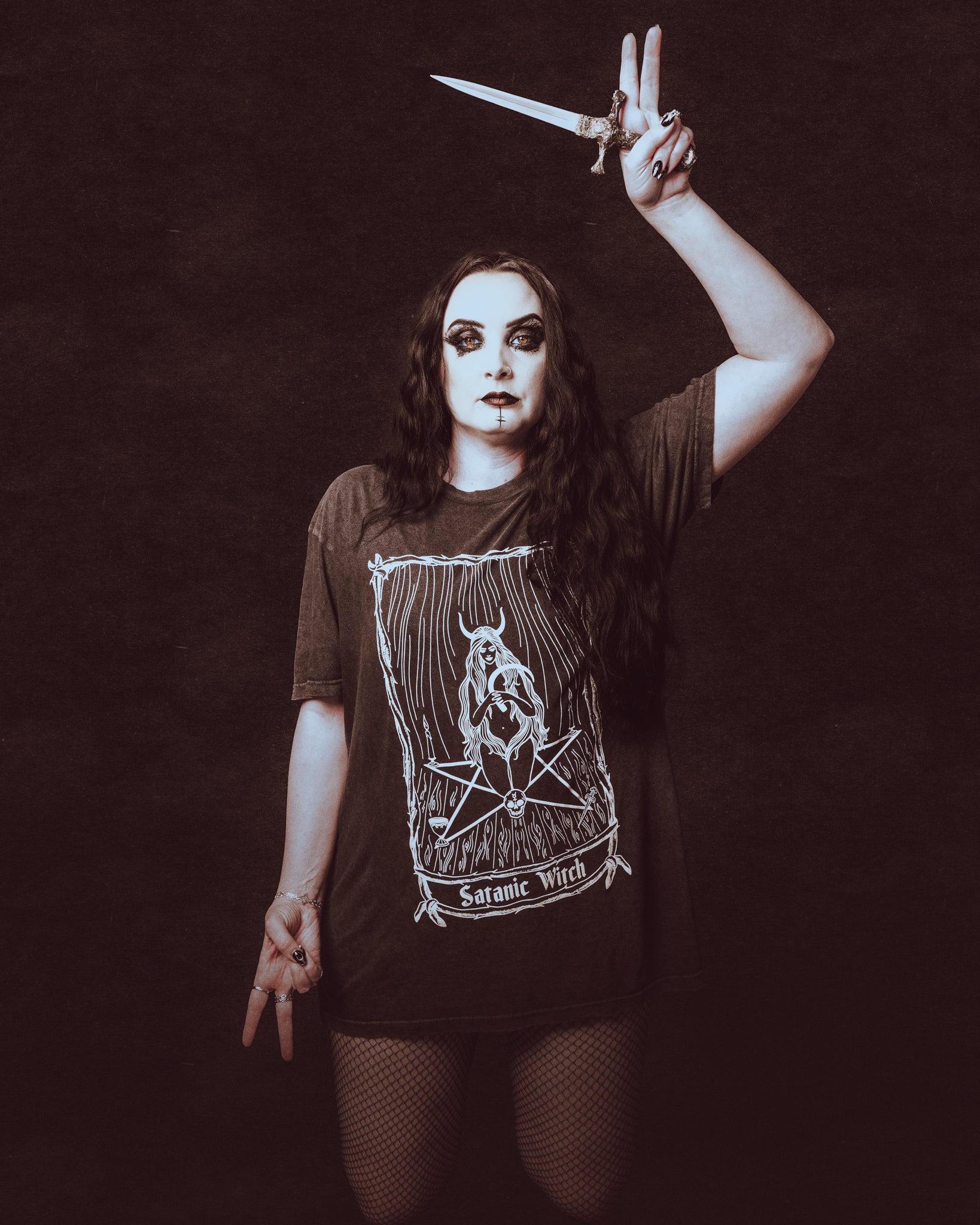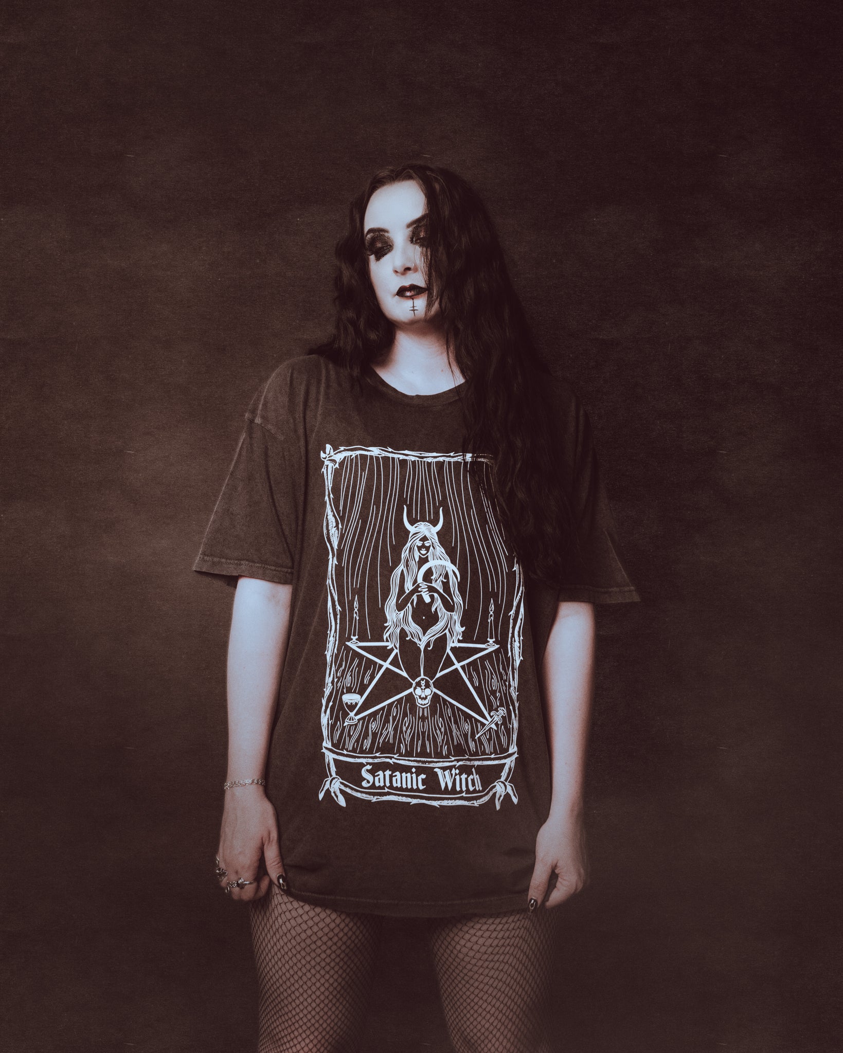 Step into your power with the Satanic Witch Tee. Soft, oversized, and easy to style, this tee features our classic Satanic Witch design printed on 100% ring-spun cotton. Made for everyday wear with a relaxed, lived-in feel, it pairs effortlessly with denim, leather, or layered looks.