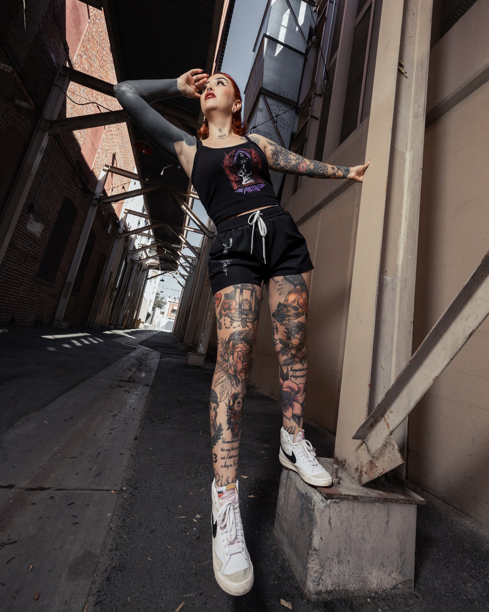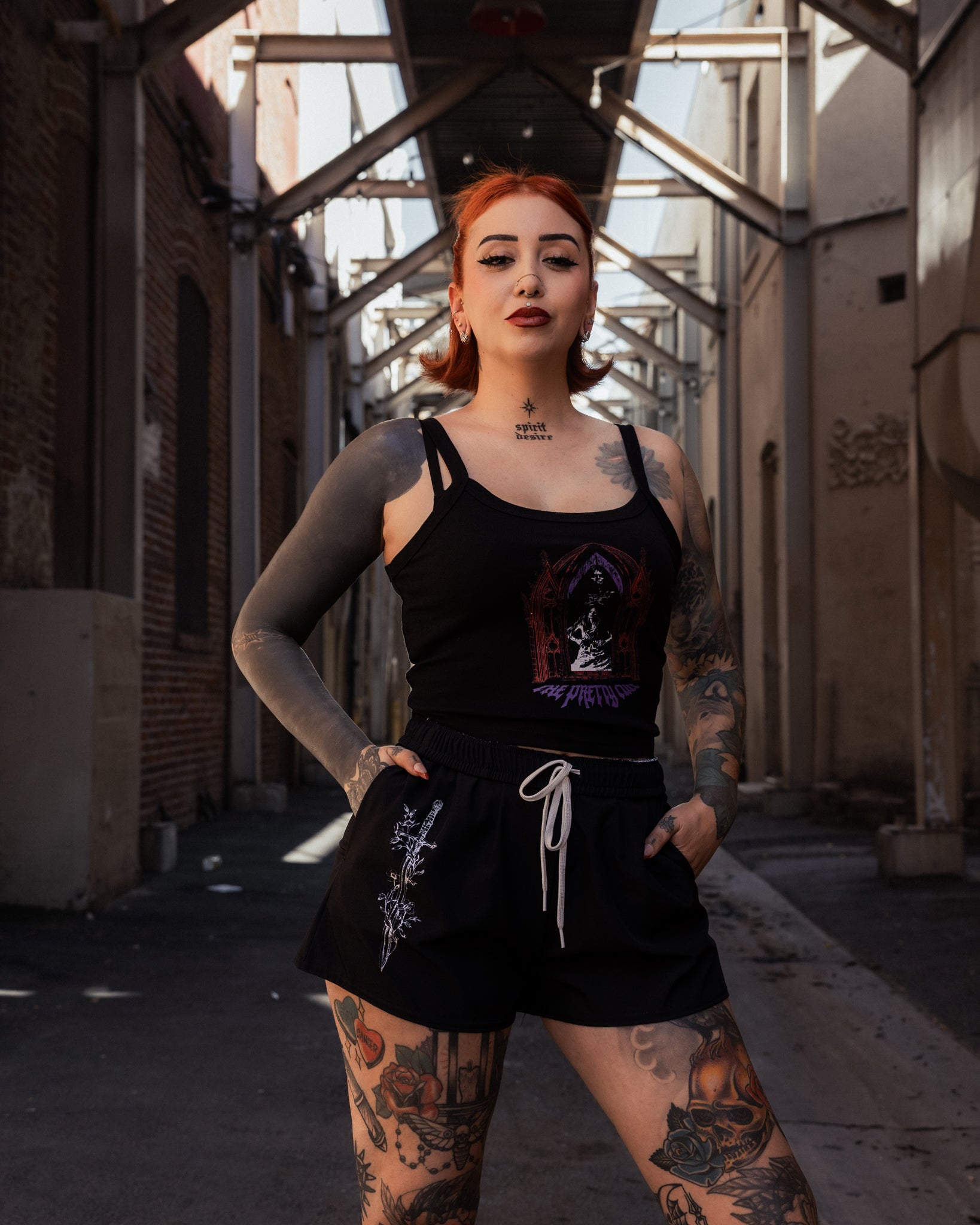Plug into power with the Electric Witch Tank Top a mid-length, 1×1 micro-rib tank crafted from a 52% Airlume combed & ring-spun cotton / 48% polyester blend. With thick straps, a scoop neck, and a stretch fit built for ritual-ready streetwear. Designed in Los Angeles for bold spirits and modern witches.