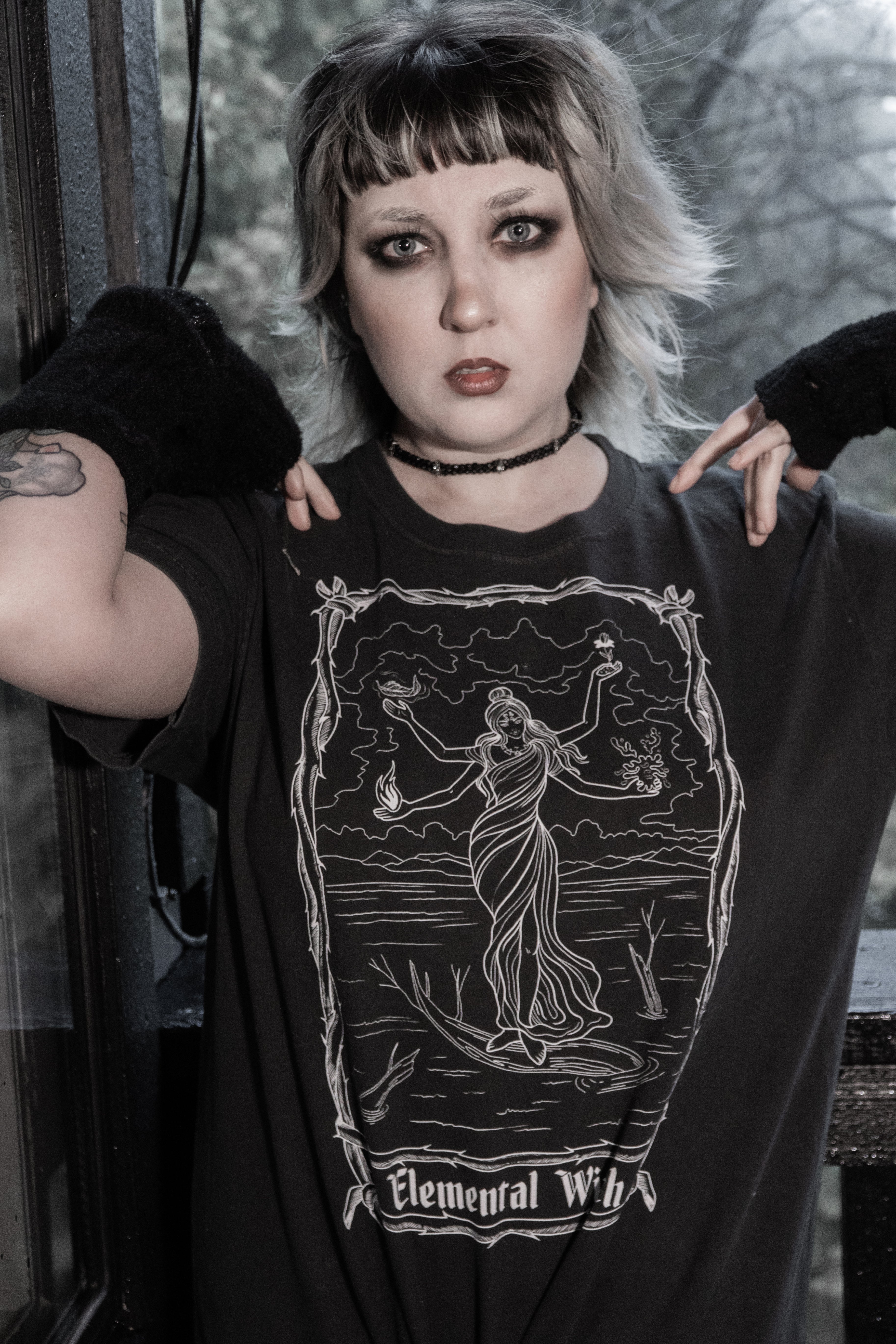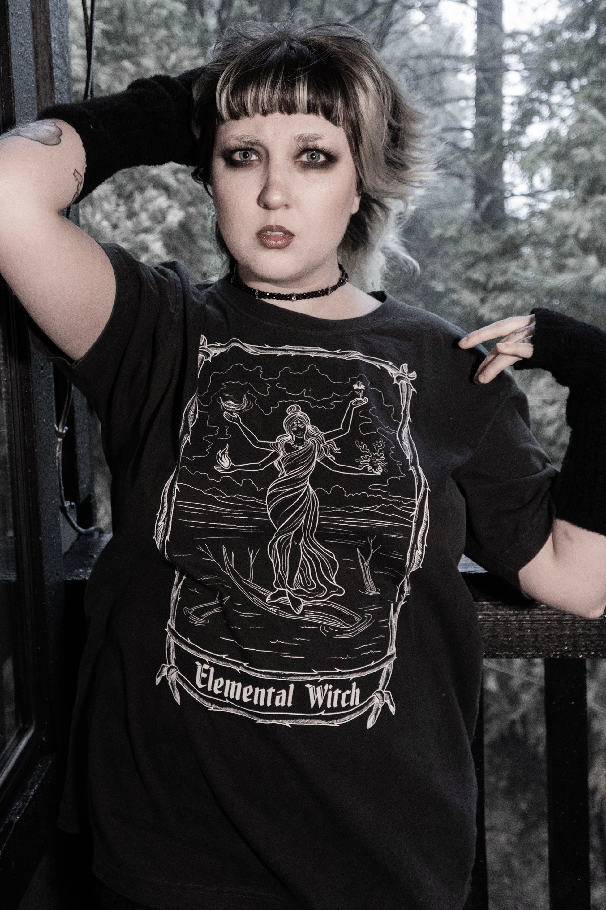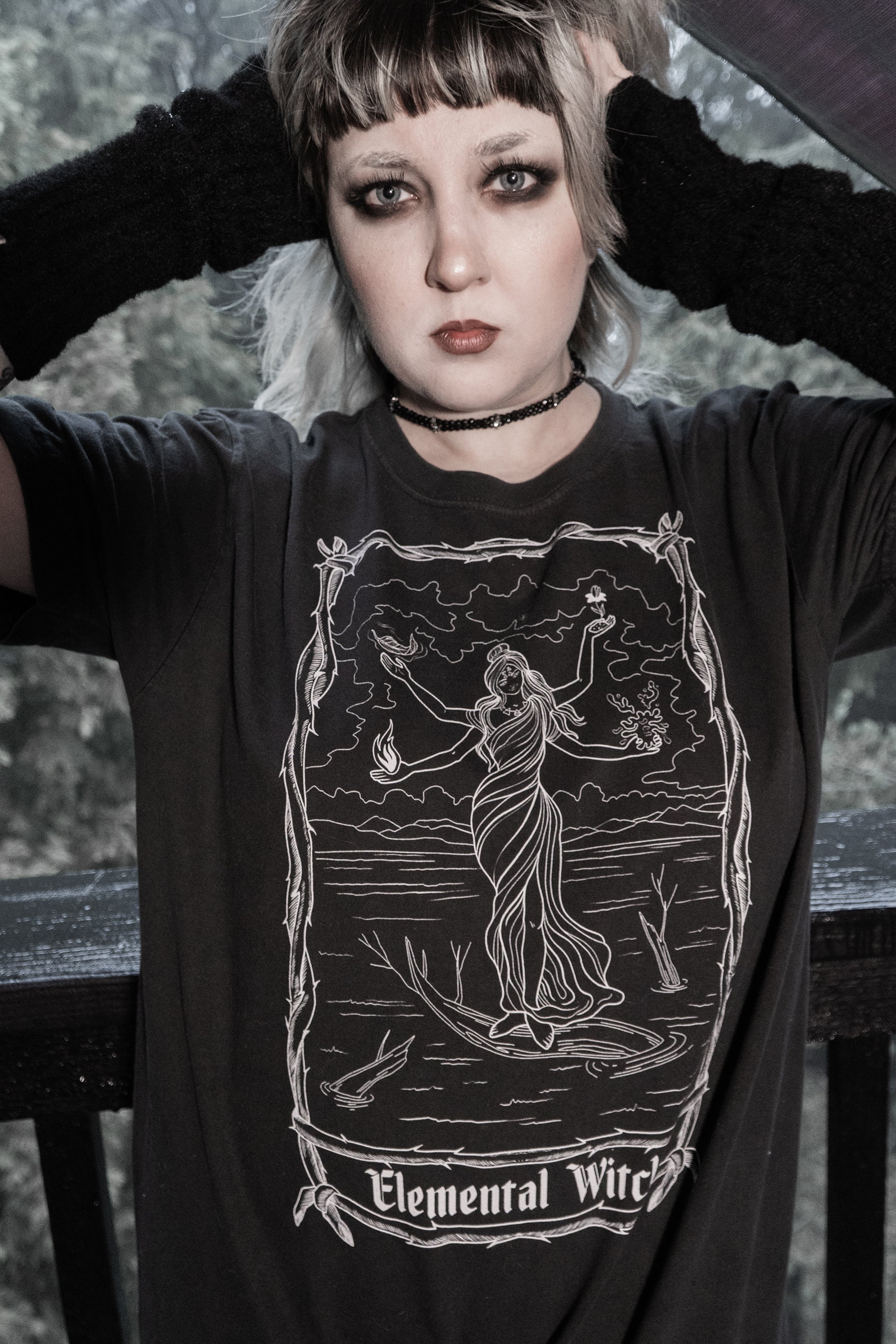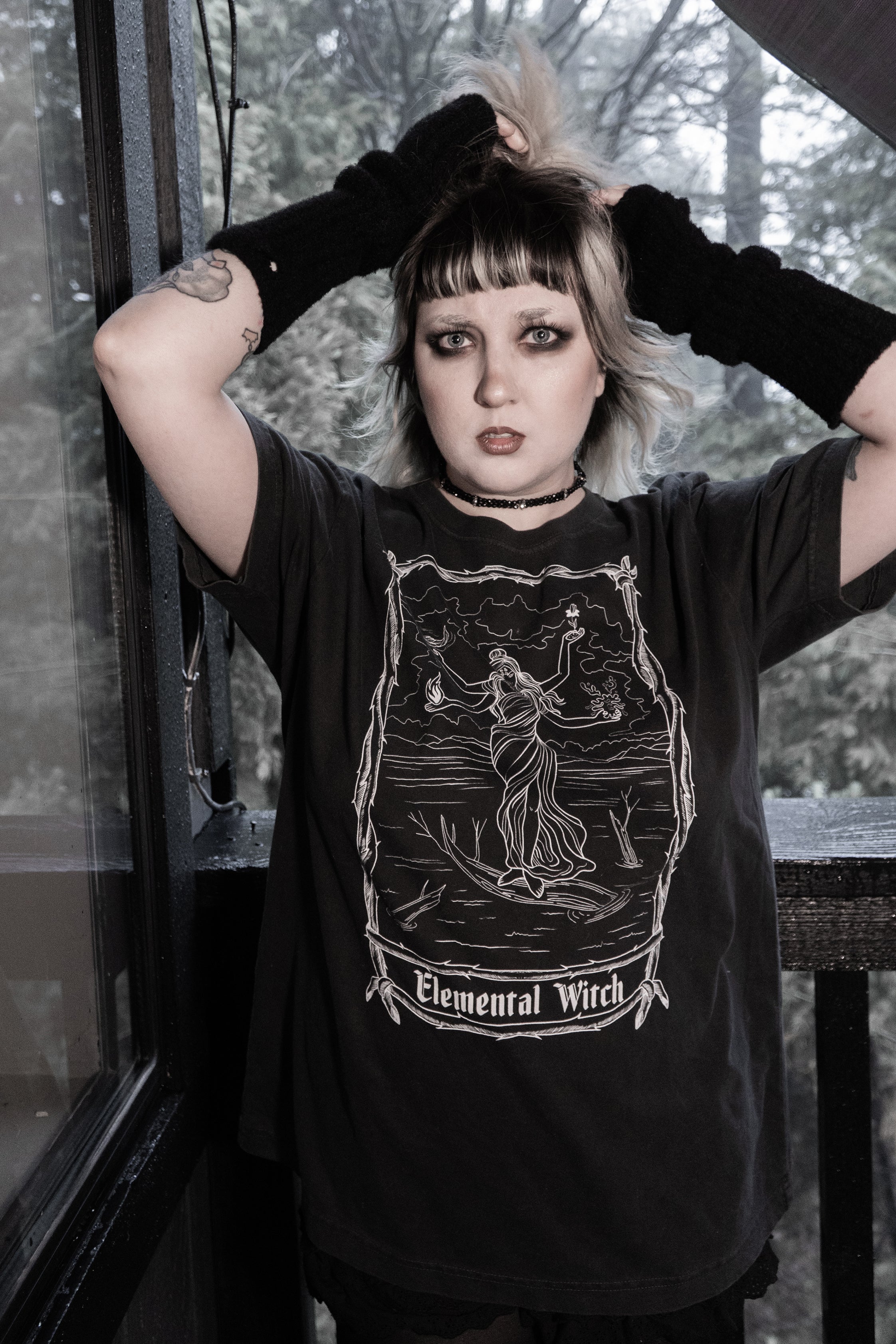 The Elemental Witch Tee is an easy, everyday tee with a relaxed fit and worn-in feel. Made from soft 100% cotton, it’s comfortable, breathable, and designed for repeat wear. Inspired by the Elemental Witch one attuned to earth, air, fire, and water this tee is made for those grounded in elemental energy. Easy to style on its own or layered, it fits seamlessly into a dark, everyday wardrobe.