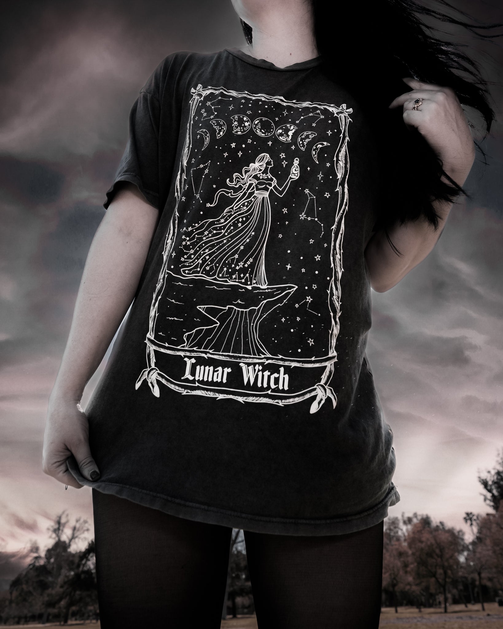 Whether you’re under the moonlight or on the city streets, this tee brings dark ease and subtle power into your everyday. Pair with leather, denim, or slip into something darker the magic’s already built in.